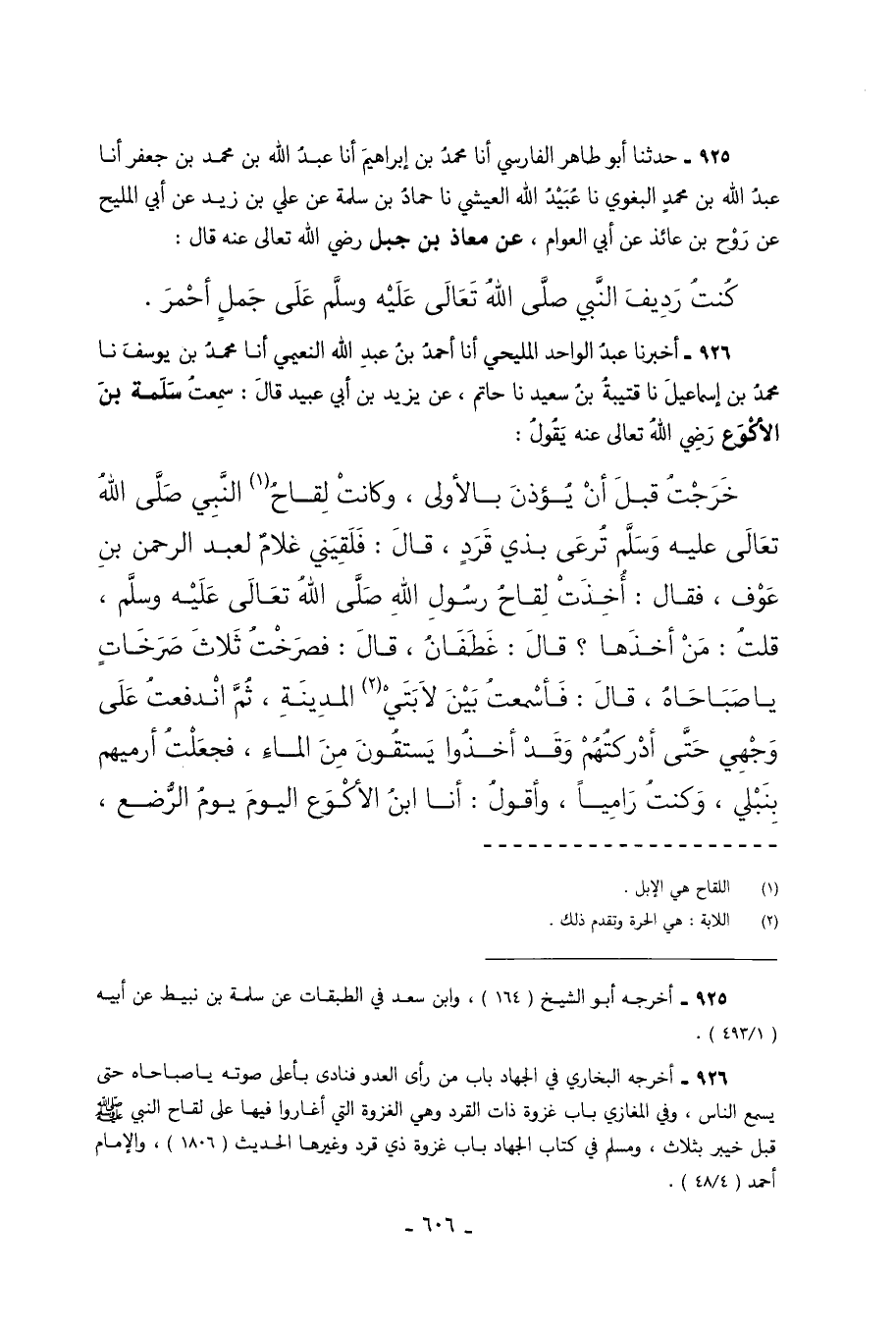 926 - أَخْبَرَنَا عَبْدُ الْوَاحِدِ الْمَلِيحِيُّ أَنَا أَحْمَدُ بْنُ عَبْدِ اللَّهِ النُّعَيْمِيُّ أَنَا مُحَمَّدُ بْنُ يُوسُفَ نَا مُحَمَّدُ بْنُ إِسْمَاعِيلَ نَا قُتَيْبَةُ بْنُ سَعِيدٍ نَا حَاتِمٌ عَنْ يَزِيدَ بْنِ أَبِي عُبَيْدٍ قَالَ سَمِعْتُ سَلَمَةَ بْنَ الأَكْوَعِ رَضِيَ اللَّهُ تَعَالَى عَنْهُ يَقُولُ خَرَجْتُ قَبْلَ أَنْ يُؤَذَّنَ بِالأُولَى وَكَانَتْ لِقَاحُ النَّبِيِّ صَلَّى اللَّهُ تَعَالَى عَلَيْهِ وَسَلَّمَ تُرْعَى بِذِي قَرَدٍ قَالَ فَلَقِيَنِي غُلامٌ لِعَبْدِ الرَّحْمَنِ بْنِ عَوْفٍ فَقَالَ أُخِذَتْ لِقَاحُ رَسُولِ اللَّهِ صَلَّى اللَّهُ تَعَالَى عَلَيْهِ وَسَلَّمَ قُلْتُ مَنْ أَخَذَهَا قَالَ غَطَفَانُ قَالَ فَصَرَخْتُ ثَلاثَ صَرَخَاتٍ يَا صَبَاحَاهُ قَالَ فَأَسْمَعْتُ بَيْنَ لابَتَيِ الْمَدِينَةِ ثُمَّ انْدَفَعْتُ عَلَى وَجْهِي حَتَّى أَدْرَكْتُهُمْ وَقَدْ أَخَذُوا يَسْتَقُونَ مِنَ الْمَاءِ فَجَعَلْتُ أَرْمِيهِمْ بِنَبْلِي وَكُنْتُ رَامِيًا وَأَقُولُ أَنَا ابْنُ الأَكْوَعِ الْيَوْمُ يَوْمُ الرُّضَّعِ