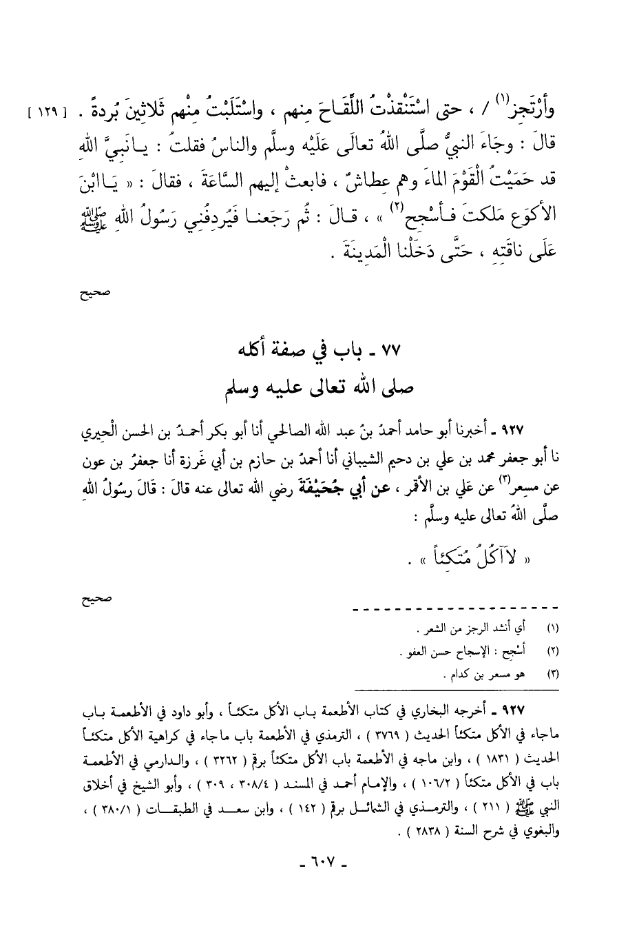 927 - أَخْبَرَنَا أَبُو حَامِدٍ أَحْمَدُ بْنُ عَبْدِ اللَّهِ الصَّالِحِيُّ أَنَا أَبُو بَكْرٍ أَحْمَدُ بْنُ الْحَسَنِ الْحِيرِيُّ نَا أَبُو جَعْفَرٍ مُحَمَّدُ بْنُ عَلِيِّ بْنِ دُحَيْمٍ الشَّيْبَانِيُّ أَنَا أَحْمَدُ بْنُ حَازِمِ بْنِ أَبِي غَرْزَةَ أَنَا جَعْفَرُ بْنُ عَوْنٍ عَنْ مِسْعَرٍ عَنْ عَلِيِّ بْنِ الأَقْمَرِ عَنْ أَبِي جُحَيْفَةَ رَضِيَ اللَّهُ تَعَالَى عَنْهُ قَالَ قَالَ رَسُولُ اللَّهِ صَلَّى اللَّهُ تَعَالَى عَلَيْهِ وَسَلَّمَ لا آكل متكئا. صحيح