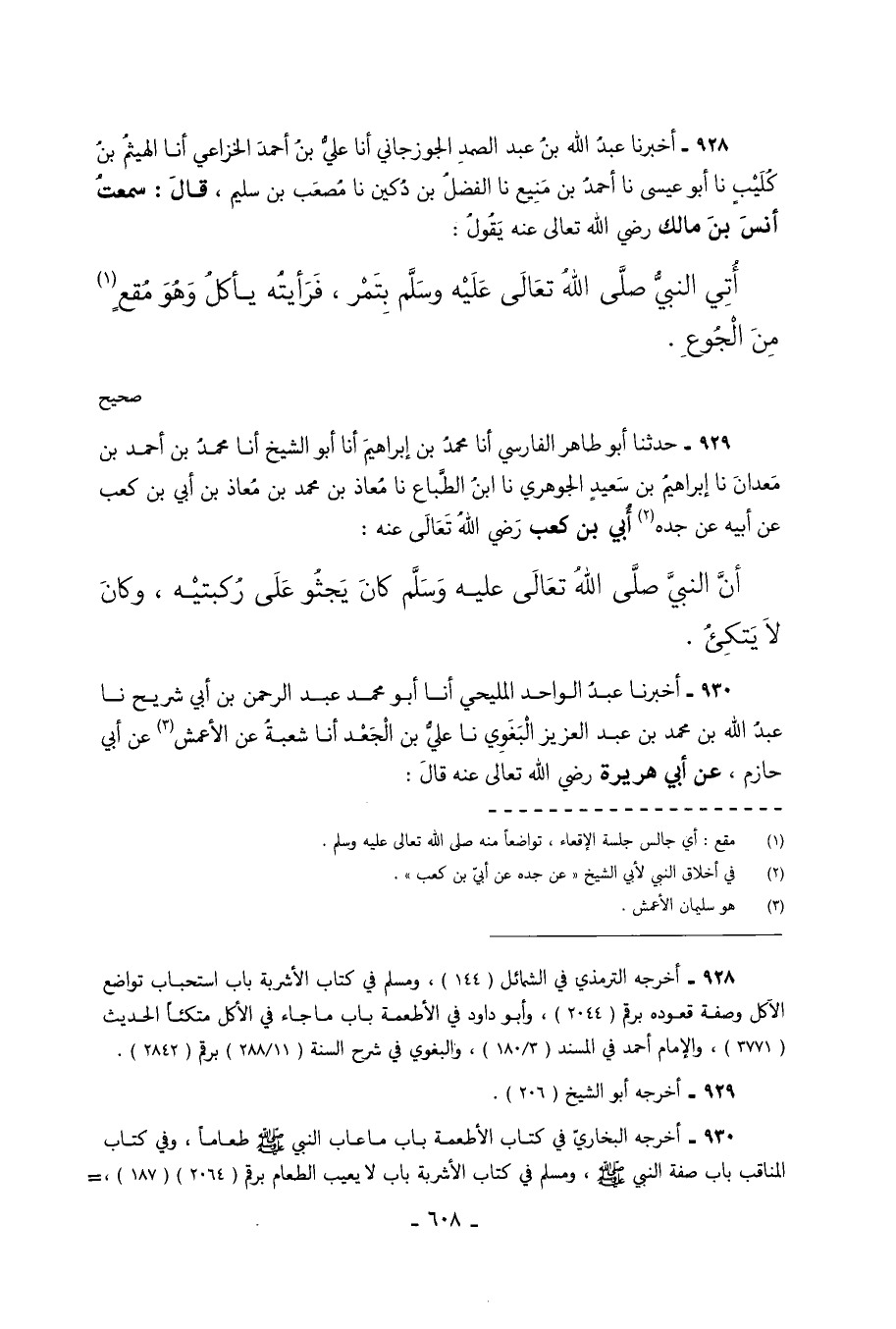 929 - حَدَّثَنَا أَبُو طَاهِرٍ الْفَارِسِيُّ أَنَا مُحَمَّدُ بْنُ إِبْرَاهِيمَ أَنَا أَبُو الشَّيْخِ أَنَا مُحَمَّدُ بْنُ أَحْمَدَ بْنِ مَعْدَانَ نَا إِبْرَاهِيمُ بْنُ سَعِيدٍ الْجَوْهَرِيُّ نَا ابْنُ الطَّبَّاعِ نَا مُعَاذُ بْنُ مُحَمَّدِ بْنِ مُعَاذِ بْنِ أُبَيِّ بْنِ كَعْبٍ عَنْ أَبِيهِ عَنْ جَدِّهِ أُبَيِّ بْنِ كَعْبٍ رضي الله تعالىعنه أَنَّ النَّبِيَّ صَلَّى اللَّهُ تَعَالَى عَلَيْهِ وَسَلَّمَ كَانَ يَجْثُو عَلَى رُكْبَتَيْهِ وَكَانَ لا يَتَّكِئُ.