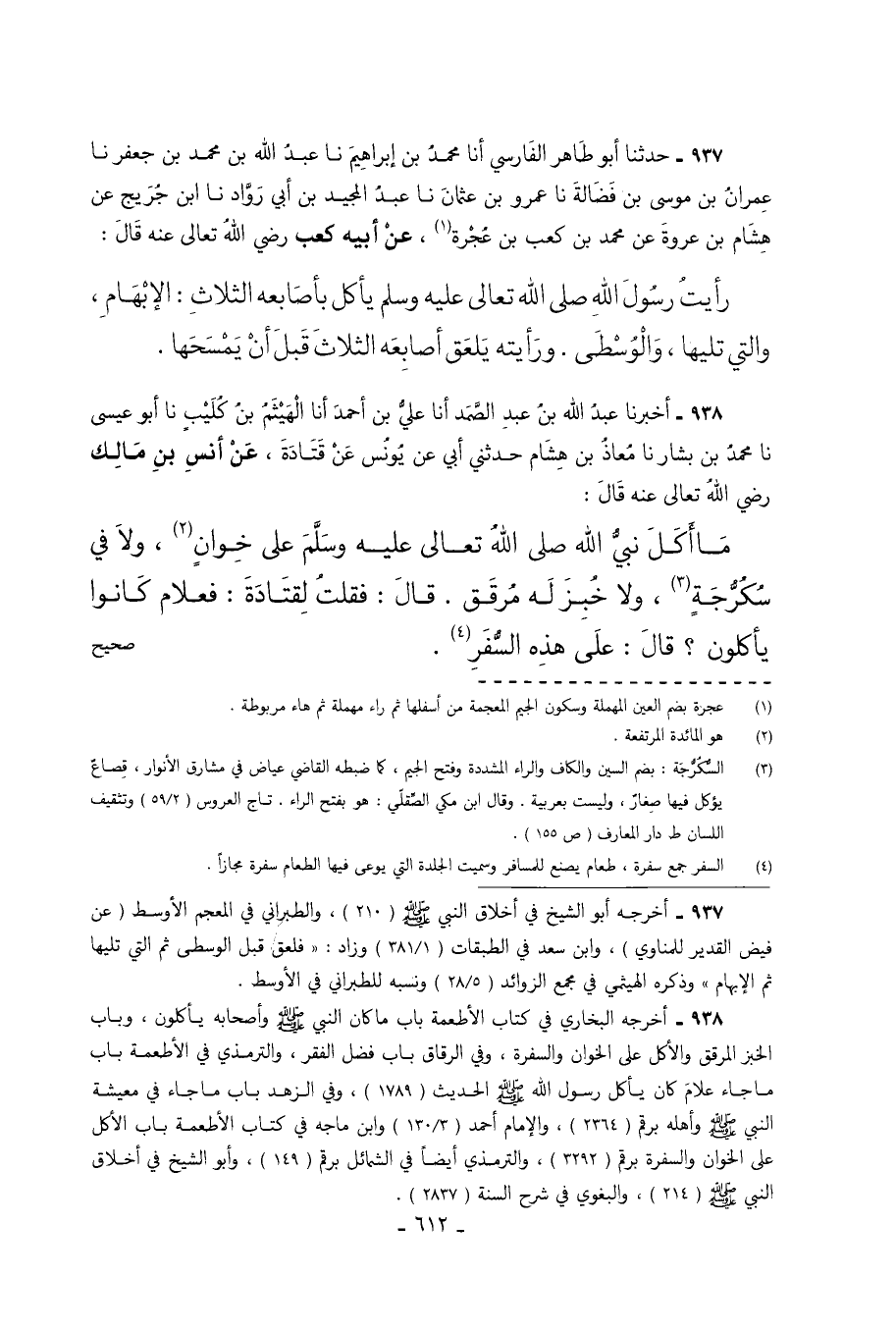 937 - حَدَّثَنَا أَبُو طَاهِرٍ الْفَارِسِيُّ أَنَا مُحَمَّدُ بْنُ إِبْرَاهِيمَ نَا عَبْدُ اللَّهِ بْنُ مُحَمَّدِ بْنِ جَعْفَرٍ نَا عِمْرَانُ بْنُ مُوسَى بْنِ فَضَالَةَ نَا عَمْرِو بْنُ عُثْمَانَ نَا عَبْدُ الْمَجِيدِ بْنُ أَبِي رَوَّادٍ نَا ابْنُ جُرَيْجٍ عَنْ هِشَامِ بْنِ عُرْوَةَ عَنْ مُحَمَّدِ بْنِ كَعْبِ بْنِ عُجْرَةَ عَنْ أَبِيهِ كَعْبٍ رَضِيَ اللَّهُ تَعَالَى عَنْهُ قَالَ رَأَيْتُ رَسُولَ اللَّهِ صَلَّى اللَّهُ تَعَالَى عَلَيْهِ وَسَلَّمَ يَأْكُلُ بِأَصَابِعِهِ الثَّلاثِ الإِبْهَامِ وَالَّتِي تَلِيهَا وَالْوُسْطَى وَرَأَيْتُهُ يَلْعَقُ أَصَابِعَهُ الثَّلاثَ قَبْلَ أَنْ يَمْسَحَهَا.