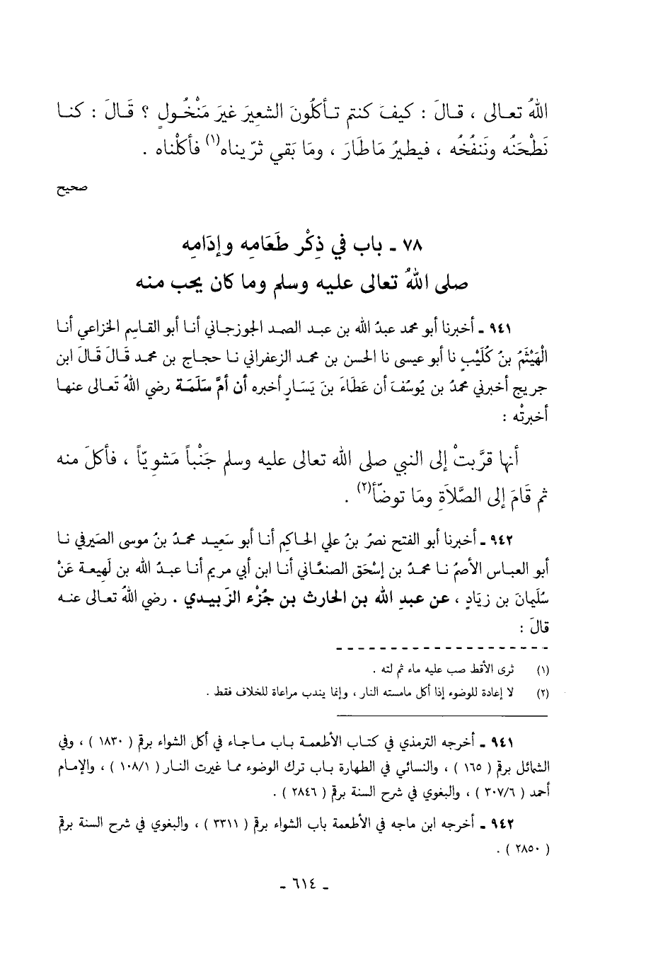 941 - أَخْبَرَنَا أَبُو مُحَمَّدٍ عَبْدُ اللَّهِ بْنُ عَبْدِ الصَّمَدِ الْجُوزَجَانِيُّ أَنَا أَبُو الْقَاسِمِ الْخُزَاعِيُّ أَنَا الْهَيْثَمُ بْنُ كُلَيْبٍ نَا أَبُو عِيسَى نَا الْحَسَنُ بْنُ مُحَمَّدٍ الزَّعْفَرَانِيُّ نَا حَجَّاجُ بْنُ مُحَمَّدٍ قَالَ قَالَ ابْنُ جُرَيْجٍ أَخْبَرَنِي مُحَمَّدُ بْنُ يُوسُفَ أَنَّ عَطَاءَ بْنَ يَسَارٍ أَخْبَرَهُ أَنَّ أُمَّ سَلَمَةَ رَضِيَ اللَّهُ تَعَالَى عَنْهَا أَخْبَرَتْهُ أَنَّهَا قَرَّبَتْ إِلَى النَّبِيِّ صَلَّى اللَّهُ تَعَالَى عَلَيْهِ وَسَلَّمَ جَنْبًا مَشْوِيًّا فَأَكَلَ مِنْهُ ثُمَّ قَامَ إِلَى الصَّلاةِ وَمَا تَوَضَّأَ.