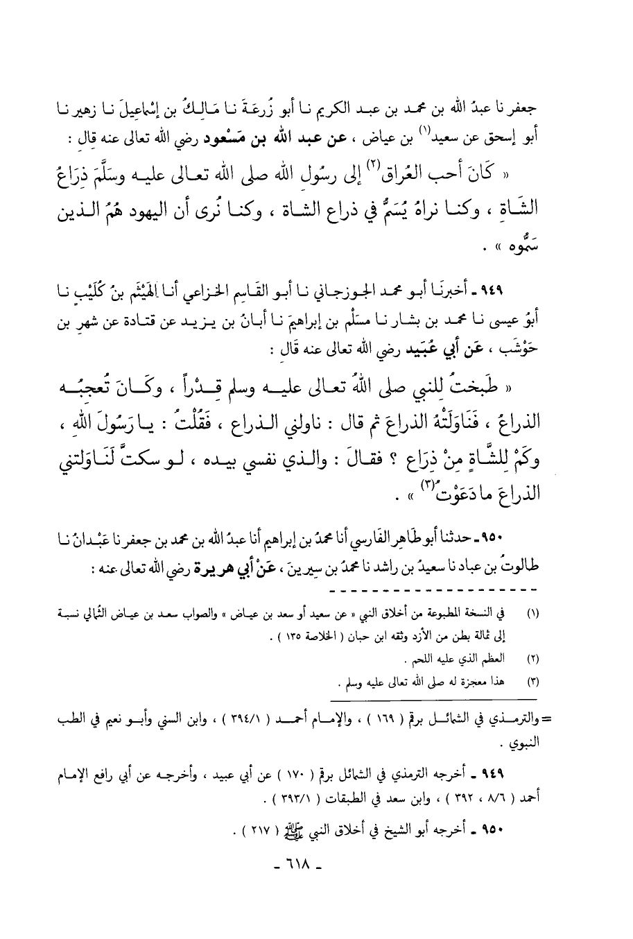 949 - أَخْبَرَنَا أَبُو مُحَمَّدٍ الْجُوزَجَانِيُّ نَا أَبُو الْقَاسِمِ الْخُزَاعِيُّ أَنَا الْهَيْثَمُ بْنُ كُلَيْبٍ نَا أَبُو عِيسَى نَا مُحَمَّدُ بْنُ بَشَّارٍ نَا مُسْلِمُ بْنُ إِبْرَاهِيمَ نَا أَبَانُ بْنُ يَزِيدَ عَنْ قَتَادَةَ عَنْ شَهْرِ بْنِ حَوْشَبٍ عَنْ أَبِي عُبَيْدٍ رَضِيَ اللَّهُ تَعَالَى عَنْهُ قَالَ طَبَخْتُ لِلنَّبِيِّ صَلَّى اللَّهُ تَعَالَى عَلَيْهِ وَسَلَّمَ قِدْرًا وَكَانَ تُعْجِبُهُ الذِّرَاعُ فَنَاوَلْتُهُ الذِّرَاعَ ثُمَّ قَالَ نَاوِلْنِي الذِّرَاعَ فَقُلْتُ يَا رَسُولَ اللَّهِ وَكَمْ لِلشَّاةِ مِنْ ذِرَاعٍ فَقَالَ وَالَّذِي نَفْسِي بِيَدِهِ لَوْ سَكَتَّ لَنَاوَلْتَنِي الذِّرَاعَ مَا دَعَوْتُ.