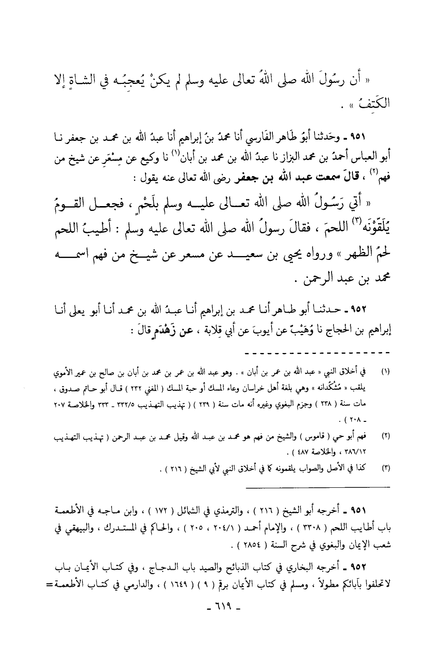 951 - وَحَدَّثَنَا أَبُو طَاهِرٍ الْفَارِسِيُّ أَنَا مُحَمَّدُ بْنُ إِبْرَاهِيمَ أَنَا عَبْدُ اللَّهِ بْنُ مُحَمَّدِ بْنِ جَعْفَرٍ نَا أَبُو الْعَبَّاسِ أَحْمَدُ بْنُ مُحَمَّدٍ الْبَزَّازُ نَا عَبْدُ اللَّهِ بْنُ مُحَمَّدِ بْنِ أَبَانٍ نَا وَكِيعٌ عَنْ مِسْعَرٍ عَنْ شَيْخٍ مِنْ فَهْمٍ قَالَ سَمِعْتُ عَبْدَ اللَّهِ بْنَ جَعْفَرٍ رَضِيَ اللَّهُ تَعَالَى عَنْهُ يَقُولُ أُتِيَ رَسُولُ اللَّهِ صَلَّى اللَّهُ تَعَالَى عَلَيْهِ وَسَلَّمَ بِلَحْمٍ فجعل القوم يلقونه اللَّحْمَ فَقَالَ رَسُولُ اللَّهِ صَلَّى اللَّهُ تَعَالَى عَلَيْهِ وَسَلَّمَ أَطْيَبُ اللَّحْمِ لَحْمُ الظَّهْرِ وَرَوَاهُ يَحْيَى بْنُ سَعِيدٍ عَنْ مِسْعَرٍ عَنْ شَيْخٍ مِنْ فَهْمٍ اسْمُهُ مُحَمَّدُ بْنُ عَبْدِ الرَّحْمَنِ.