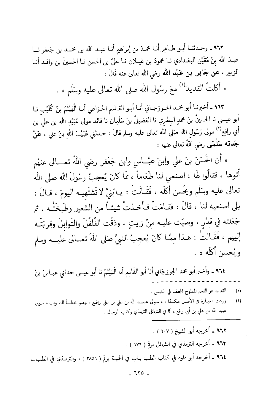 963 - أَخْبَرَنَا أَبُو مُحَمَّدٍ الْجُوزَجَانِيُّ أَنَا أَبُو الْقَاسِمِ الْخُزَاعِيُّ أَنَا الْهَيْثَمُ بْنُ كُلَيْبٍ نَا أَبُو عِيسَى نَا الْحُسَيْنُ بْنُ مُحَمَّدٍ الْبَصْرِيُّ نَا الْفُضَيْلُ بْنُ سُلَيْمَانَ نَا فَائِدٌ مَوْلَى عُبَيْدِ اللَّهِ بْنِ عَلِيِّ بْنِ أَبِي رَافِعٍ مَوْلَى رَسُولِ اللَّهِ صَلَّى اللَّهُ تَعَالَى عَلَيْهِ وَسَلَّمَ قَالَ حَدَّثَنِي عُبَيْدُ اللَّهِ بْنُ عَلِيٍّ عَنْ جَدَّتِهِ سَلْمَى رَضِيَ اللَّهُ تَعَالَى عَنْهَا أَنَّ الْحَسَنَ بْنَ عَلِيٍّ وَابْنَ عَبَّاسٍ وابْنَ جَعْفَرٍ رَضِيَ اللَّهُ تَعَالَى عَنْهُمْ أَتَوْهَا فَقَالُوا لَهَا اصْنَعِي لَنَا طَعَامًا مِمَّا كَانَ يُعْجِبُ رَسُولَ اللَّهِ صَلَّى اللَّهُ تَعَالَى عَلَيْهِ وَسَلَّمَ وَيُحْسِنُ أَكْلَهُ فَقَالَتْ يَا بني لا تشتهيه اليوم قال بَلَى اصْنَعِيهِ لَنَا قَالَ فَقَامَتْ فَأَخَذَتْ شَيْئًا مِنَ الشَّعِيرِ وَطَبَخَتْهُ ثُمَّ جَعَلَتْهُ فِي قِدْرٍ وَصَبَّتْ عَلَيْهِ مِنْ زَيْتٍ وَدَقَّتِ الْفُلْفُلَ وَالتَّوَابِلَ وَقَرَّبَتْهُ إِلَيْهِمْ فَقَالَتْ هَذَا مِمَّا كَانَ يُعْجِبُ النَّبِيَّ صَلَّى اللَّهُ تَعَالَى عَلَيْهِ وَسَلَّمَ وَيُحْسِنُ أَكْلَهُ.