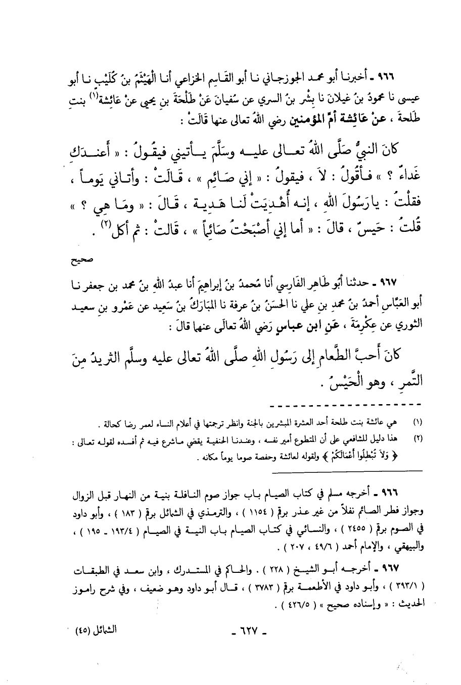 966 - أَخْبَرَنَا أَبُو مُحَمَّدٍ الْجُوزَجَانِيُّ نَا أَبُو الْقَاسِمِ الْخُزَاعِيُّ أَنَا الْهَيْثَمُ بْنُ كُلَيْبٍ نَا أَبُو عِيسَى نَا مَحْمُودُ بْنُ غَيْلانَ نَا بِشْرُ بْنُ السَّرِيِّ عَنْ سُفْيَانَ عَنْ طَلْحَةَ بْنِ يَحْيَى عَنْ عَائِشَةَ بِنْتِ طَلْحَةَ عَنْ عَائِشَةَ أُمِّ الْمُؤْمِنِينَ رَضِيَ اللَّهُ تَعَالَى عَنْهَا قَالَتْ كَانَ النَّبِيُّ صَلَّى اللَّهُ تَعَالَى عَلَيْهِ وَسَلَّمَ يَأْتِينِي فَيَقُولُ أَعِنْدَكِ غَدَاءٌ فَأَقُولُ لا فَيَقُولُ إِنِّي صَائِمٌ قَالَتْ وَأَتَانِي يَوْمًا فَقُلْتُ يَا رَسُولَ اللَّهِ إِنَّهُ أُهْدِيَتْ لَنَا هَدِيَّةٌ قَالَ وَمَا هِيَ قُلْتُ حَيْسٌ قَالَ أَمَا إِنِّي أَصْبَحْتُ صَائِمًا قَالَتْ ثم أكل. صحيح