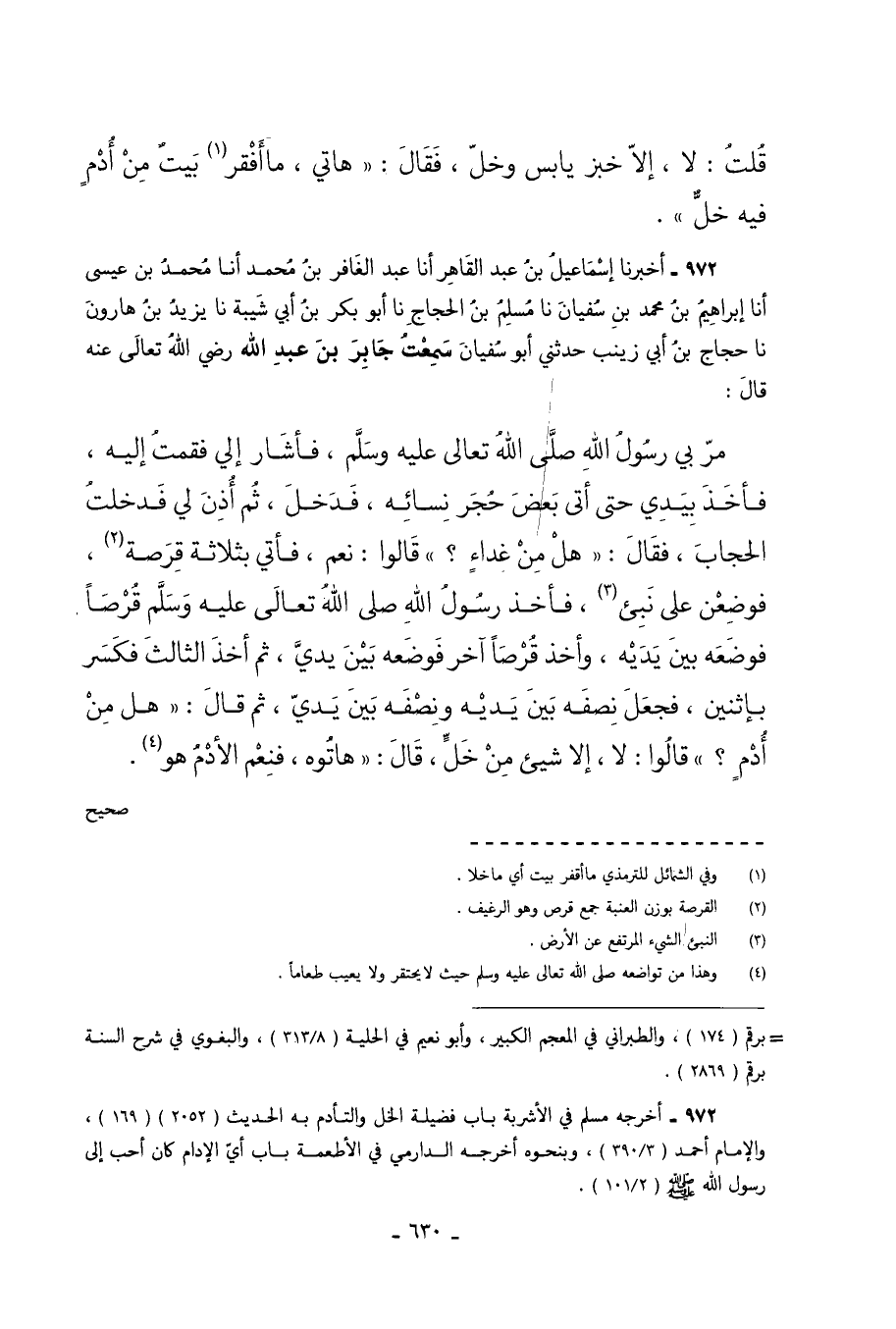 972 - أَخْبَرَنَا إِسْمَاعِيلُ بْنُ عَبْدِ الْقَاهِرِ أَنَا عَبْدُ الْغَافِرِ بْنُ مُحَمَّدٍ أَنَا مُحَمَّدُ بْنُ عِيسَى أَنَا إِبْرَاهِيمُ بْنُ مُحَمَّدِ بْنِ سُفْيَانَ نَا مُسْلِمُ بْنُ الْحَجَّاجِ نَا أَبُو بَكْرٍ بن أَبِي شَيْبَةَ نَا يَزِيدُ بْنُ هَارُونَ نَا حَجَّاجُ بْنُ أَبِي زَيْنَبَ حَدَّثَنِي أَبُو سُفْيَانَ سَمِعْتُ جَابِرَ بْنَ عَبْدِ اللَّهِ رَضِيَ اللَّهُ تَعَالَى عَنْهُ قَالَ مَرَّ بِي رَسُولُ اللَّهِ صَلَّى اللَّهُ تَعَالَى عَلَيْهِ وَسَلَّمَ فَأَشَارَ إِلَيَّ فَقُمْتُ إِلَيْهِ فَأَخَذَ بِيَدِي حَتَّى أَتَى بَعْضَ حُجَرِ نِسَائِهِ فَدَخَلَ ثُمَّ أُذِنَ لِي فَدَخَلْتُ الْحِجَابَ فَقَالَ هَلْ مِنْ غَدَاءٍ قَالُوا نَعَمْ فَأُتِيَ بِثَلاثَةِ قِرَصَةٍ فوضعن على نبئ فَأَخَذَ رَسُولُ اللَّهِ صَلَّى اللَّهُ تَعَالَى عَلَيْهِ وَسَلَّمَ قُرْصًا فَوَضَعَهُ بَيْنَ يَدَيْهِ وَأَخَذَ قُرْصًا آخَرَ فَوَضَعَهُ بَيْنَ يَدَيَّ ثُمَّ أَخَذَ الثَّالِثَ فَكَسَرَ بِاثْنَيْنِ فَجَعَلَ نِصْفَهُ بَيْنَ يَدَيْهِ وَنِصْفَهُ بَيْنَ يَدَيَّ ثُمَّ قَالَ هَلْ مِنْ أُدُمٍ قَالُوا لا إلا شيئ مِنْ خَلٍّ قَالَ هَاتُوهُ فَنِعْمَ الأدم هو. صحيح