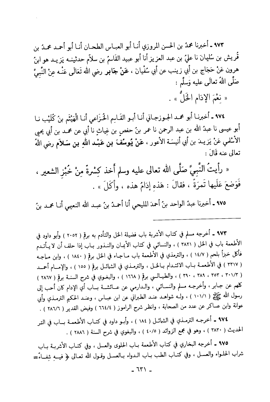 973 - أَخْبَرَنَا مُحَمَّدُ بْنُ الْحَسَنِ الْمَرْوَزِيُّ أَنَا أَبُو الْعَبَّاسِ الطَّحَّانُ أَنَا أَبُو أَحْمَدَ مُحَمَّدُ بْنُ قُرَيْشِ بْنِ سُلَيْمَانَ نَا عَلِيُّ بْنُ عَبْدِ الْعَزِيزِ أَنَا أَبُو عُبَيْدِ الْقَاسِمِ بن سلام حدثنيه يَزِيدُ هو ابن هرون عَنْ حَجَّاجِ بْنِ أَبِي زَيْنَبَ عَنْ أَبِي سُفْيَانَ عَنْ جَابِرٍ رَضِيَ اللَّهُ تَعَالَى عَنْهُ عَنِ النَّبِيِّ صَلَّى اللَّهُ تَعَالَى عَلَيْهِ وَسَلَّمَ نِعْمَ الإِدَامُ الْخَلُّ.