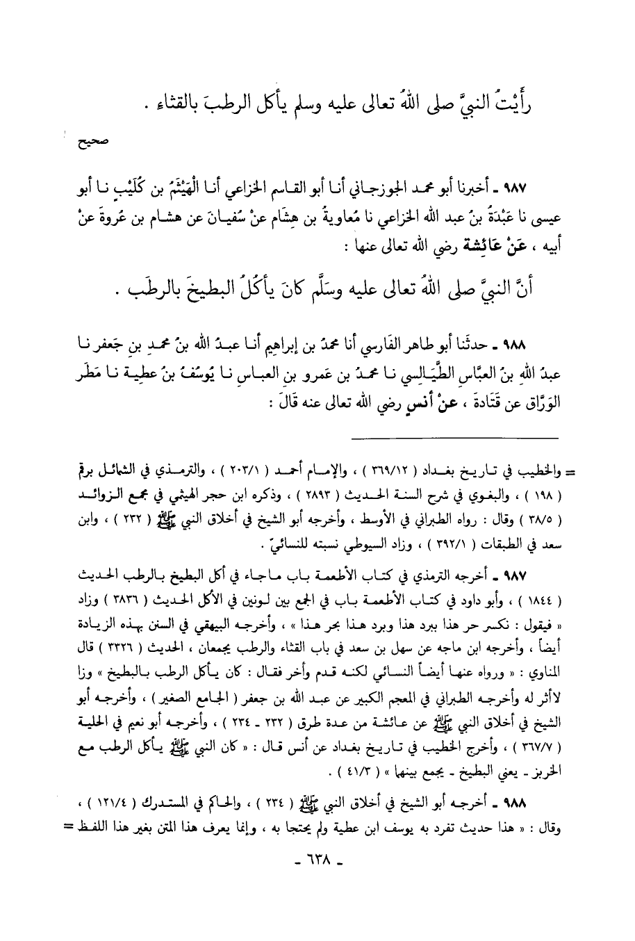 987 - أَخْبَرَنَا أَبُو مُحَمَّدٍ الْجُوزَجَانِيُّ أَنَا أَبُو الْقَاسِمِ الْخُزَاعِيُّ أَنَا الْهَيْثَمُ بْنُ كُلَيْبٍ نَا أَبُو عِيسَى نَا عَبْدَةُ بْنُ عَبْدِ اللَّهِ الْخُزَاعِيُّ نَا مُعَاوِيَةُ بْنُ هِشَامٍ عَنْ سُفْيَانَ عَنْ هِشَامِ بْنِ عُرْوَةَ عَنْ أَبِيهِ عَنْ عَائِشَةَ رَضِيَ اللَّهُ تَعَالَى عَنْهَا أَنَّ النَّبِيَّ صَلَّى اللَّهُ تَعَالَى عَلَيْهِ وَسَلَّمَ كَانَ يَأْكُلُ الْبِطِّيخَ بِالرُّطَبِ.