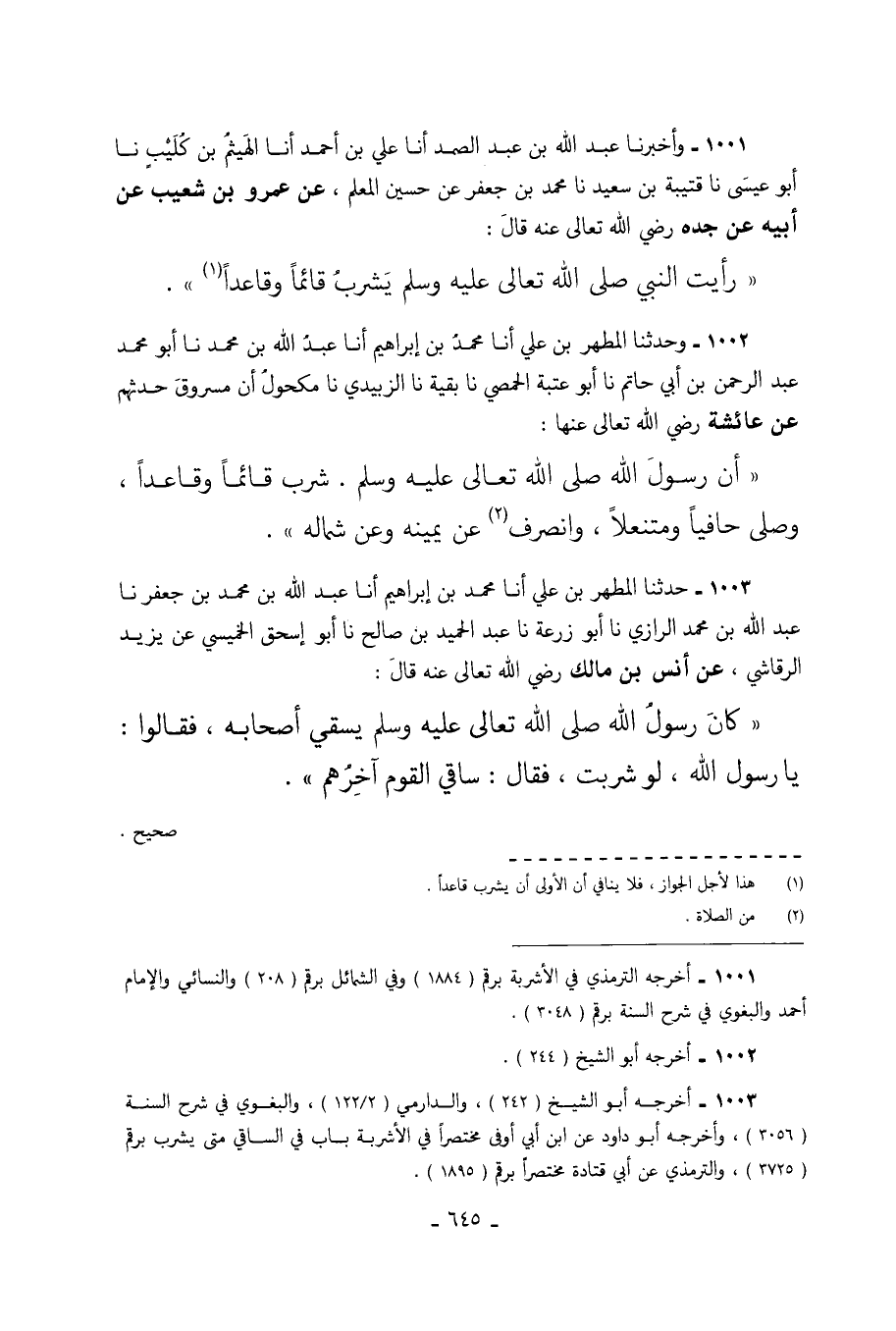 1001 - وَأَخْبَرَنَا عَبْدُ اللَّهِ بْنُ عَبْدِ الصَّمَدِ أَنَا عَلِيُّ بْنُ أَحْمَدَ أَنَا الْهَيْثَمُ بْنُ كُلَيْبٍ نَا أَبُو عِيسَى نَا قُتَيْبَةُ بْنُ سَعِيدٍ نَا مُحَمَّدُ بْنُ جَعْفَرٍ عَنْ حُسَيْنٍ الْمُعَلِّمِ عَنْ عَمْرِو بْنِ شُعَيْبٍ عَنْ أَبِيهِ عَنْ جَدِّهِ رَضِيَ اللَّهُ تَعَالَى عَنْهُ قَالَ رَأَيْتُ النَّبِيَّ صَلَّى اللَّهُ تَعَالَى عَلَيْهِ وَسَلَّمَ يَشْرَبُ قَائِمًا وَقَاعِدًا.