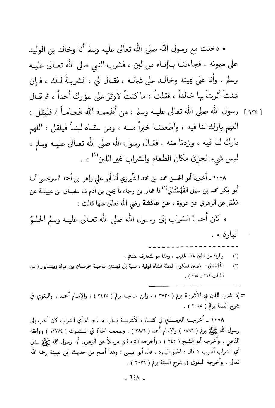 دَخَلْتُ مَعَ رَسُولِ اللَّهِ صَلَّى اللَّهُ تَعَالَى عَلَيْهِ وَسَلَّمَ أَنَا وَخَالِدُ بْنُ الْوَلِيدِ عَلَى مَيْمُونَةَ فَجَاءَتْنَا بِإِنَاءٍ مِنْ لَبَنٍ فَشَرِبَ النَّبِيُّ صَلَّى اللَّهُ تَعَالَى عَلَيْهِ وَسَلَّمَ وَأَنَا عَلَى يَمِينِهِ وَخَالِدٌ عَلَى شِمَالِهِ فَقَالَ لِي الشَّرْبَةُ لَكَ فَإِنْ شِئْتَ آثَرْتَ بِهَا خَالِدًا فَقُلْتُ مَا كُنْتُ لأُوثِرَ عَلَى سُؤْرِكَ أَحَدًا ثُمَّ قَالَ رَسُولُ اللَّهِ صَلَّى اللَّهُ تَعَالَى عَلَيْهِ وَسَلَّمَ مَنْ أَطْعَمَهُ اللَّهُ طَعَامًا فَلْيَقُلْ اللَّهُمَّ بَارِكْ لَنَا فِيهِ وَأَطْعِمْنَا خَيْرًا مِنْهُ وَمَنْ سَقَاهُ لَبَنًا فَلْيَقُلْ اللَّهُمَّ بَارِكْ لَنَا فِيهِ وَزِدْنَا مِنْهُ فَقَالَ رَسُولُ اللَّهِ صَلَّى اللَّهُ تَعَالَى عَلَيْهِ وَسَلَّمَ لَيْسَ شَيْءٌ يُجْزِئُ مَكَانَ الطَّعَامِ وَالشَّرَابِ غَيْرَ اللَّبَنِ.