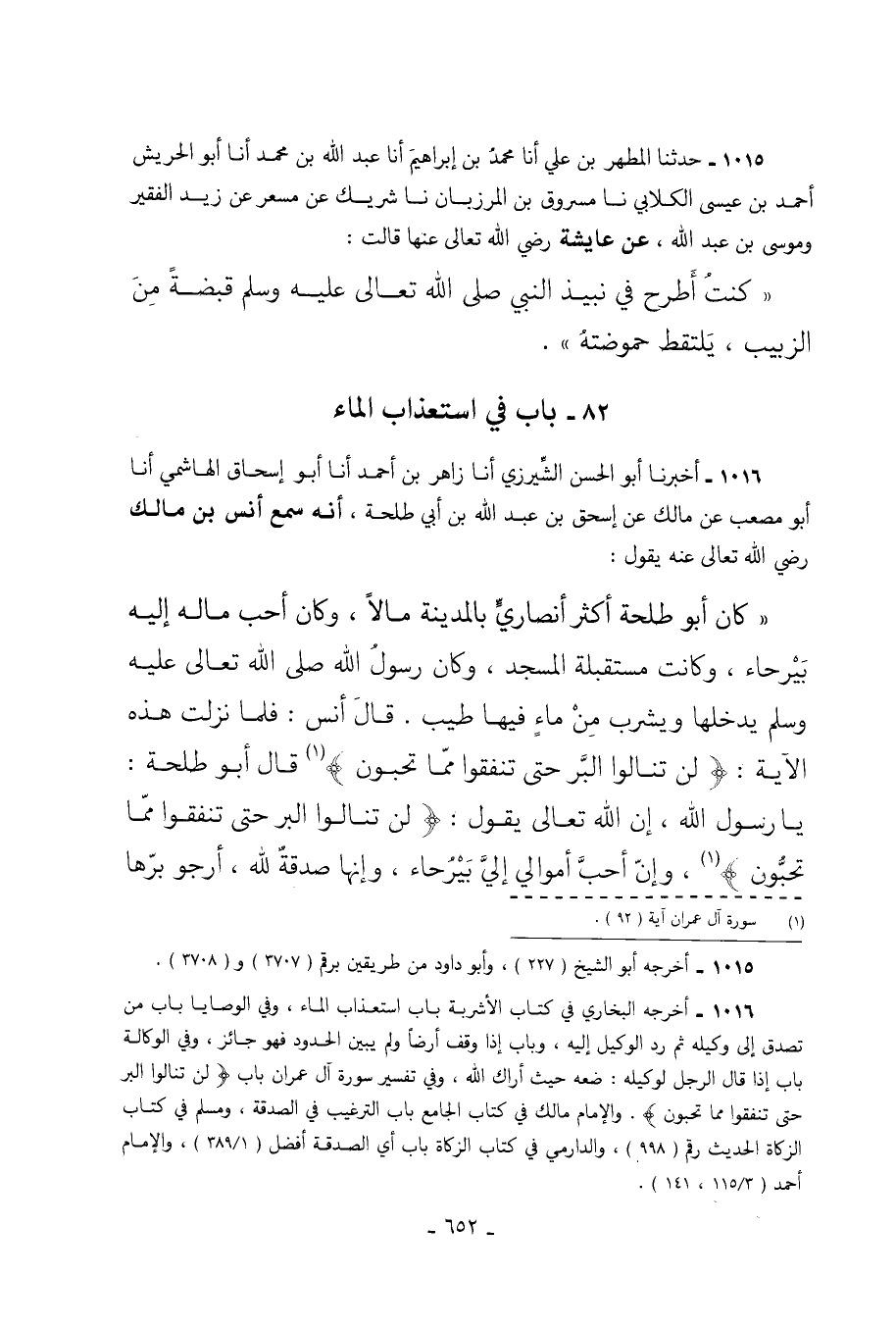 1016 - أَخْبَرَنَا أَبُو الْحَسَنِ الشِّيرَزِيُّ أَنَا زَاهِرُ بْنُ أَحْمَدَ أَنَا أَبُو إِسْحَاقَ الْهَاشِمِيُّ أَنَا أَبُو مُصْعَبٍ عَنْ مالك عن إسحق بْنِ عَبْدِ اللَّهِ بْنِ أَبِي طَلْحَةَ أَنَّهُ سَمِعَ أَنَسَ بْنَ مَالِكٍ رَضِيَ اللَّهُ تَعَالَى عَنْهُ يَقُولُ كَانَ أَبُو طَلْحَةَ أَكْثَرَ أَنْصَارِيٍّ بِالْمَدِينَةِ مَالا وَكَانَ أَحَبُّ مَالِهِ إِلَيْهِ بَيْرَحَاءَ وَكَانَتْ مُسْتَقْبِلَةَ الْمَسْجِدِ وَكَانَ رَسُولُ اللَّهِ صَلَّى اللَّهُ تَعَالَى عَلَيْهِ وَسَلَّمَ يَدْخُلُهَا وَيَشْرَبُ مِنْ مَاءٍ فِيهَا طَيِّبٍ قَالَ أَنَسٌ فَلَمَّا نَزَلَتْ هَذِهِ الآيَةُ لَنْ تَنَالُوا الْبِرَّ حَتَّى تُنْفِقُوا مِمَّا تُحِبُّونَ قَالَ أَبُو طَلْحَةَ يَا رَسُولَ اللَّهِ إِنَّ اللَّهَ تَعَالَى يَقُولُ لَنْ تَنَالُوا الْبِرَّ حَتَّى تُنْفِقُوا مِمَّا تُحِبُّونَ وَإِنَّ أَحَبَّ أَمْوَالِي إِلَيَّ بَيْرَحَاءُ وَإِنَّهَا صَدَقَةٌ لِلَّهِ أَرْجُو بِرَّهَا