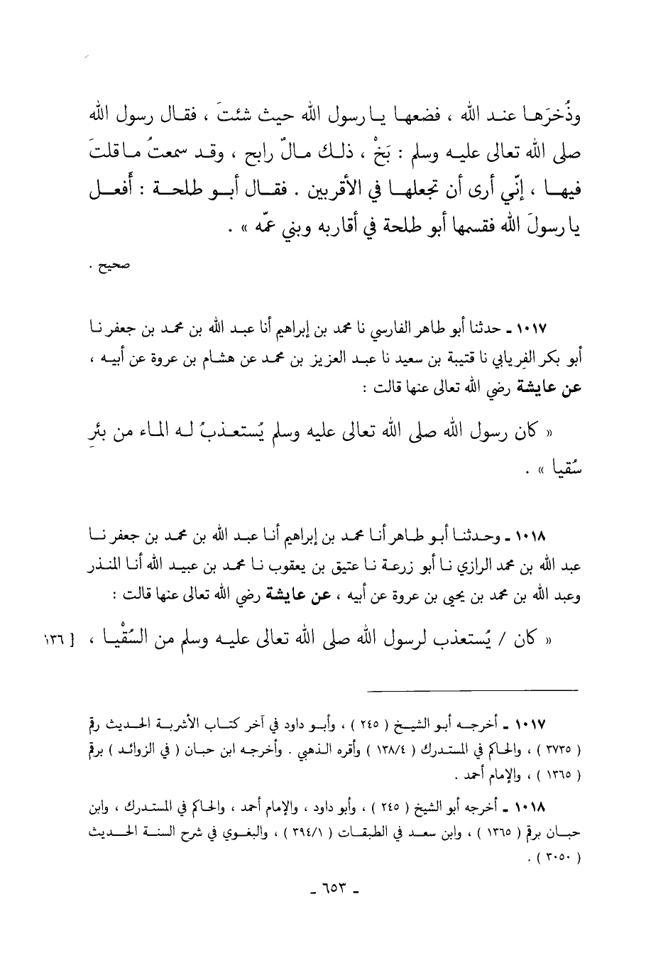 1018 - وَحَدَّثَنَا أَبُو طَاهِرٍ أَنَا مُحَمَّدُ بْنُ إِبْرَاهِيمَ أَنَا عَبْدُ اللَّهِ بْنُ مُحَمَّدِ بْنِ جَعْفَرٍ نَا عَبْدُ اللَّهِ بْنُ مُحَمَّدٍ الرَّازِيُّ نَا أَبُو زُرْعَةَ نَا عَتِيقُ بْنُ يَعْقُوبَ نَا مُحَمَّدُ بْنُ عُبَيْدِ اللَّهِ أَنَا الْمُنْذِرُ وَعَبْدُ اللَّهِ بْنُ مُحَمَّدِ بْنِ يَحْيَى بْنِ عُرْوَةَ عَنْ أَبِيهِ عَنْ عَايِشَةَ رَضِيَ اللَّهُ تَعَالَى عَنْهَا قَالَتْ كَانَ يُسْتَعْذَبُ لِرَسُولِ اللَّهِ صَلَّى اللَّهُ تَعَالَى عَلَيْهِ وَسَلَّمَ مِنَ السُّقْيَا