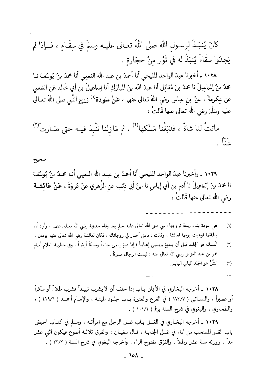 1028 - أَخْبَرَنَا عَبْدُ الْوَاحِدِ الْمَلِيحِيُّ أَنَا أَحْمَدُ بْنُ عَبْدِ اللَّهِ النُّعَيْمِيُّ أَنَا مُحَمَّدُ بْنُ يُوسُفَ نَا مُحَمَّدُ بْنُ إِسْمَاعِيلَ نَا مُحَمَّدُ بْنُ مُقَاتِلٍ أَنَا عَبْدُ اللَّهِ بْنُ الْمُبَارَكِ أَنَا إِسْمَاعِيلُ بْنُ أَبِي خَالِدٍ عَنِ الشَّعْبِيِّ عَنْ عِكْرِمَةَ عَنِ ابْنِ عَبَّاسٍ رَضِيَ اللَّهُ تَعَالَى عَنْهُمَا عَنْ سَوْدَةَ زَوْجِ النَّبِيِّ صَلَّى اللَّهُ تَعَالَى عَلَيْهِ وَسَلَّمَ رَضِيَ اللَّهُ تَعَالَى عَنْهَا قَالَتْ مَاتَتْ لَنَا شَاةٌ فَدَبَغْنَا مَسْكَهَا ثُمَّ مَا زِلْنَا نَنَبِذُ فِيهِ حَتَّى صارت شنا. صحيح