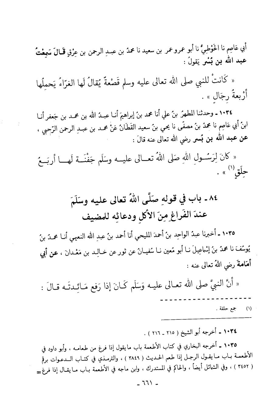 1034 - وَحَدَّثَنَا الْمُطَهَّرُ بْنُ عَلِيٍّ أَنَا مُحَمَّدُ بْنُ إِبْرَاهِيمَ أَنَا عَبْدُ اللَّهِ بْنُ مُحَمَّدِ بْنِ جَعْفَرٍ أَنَا ابْنُ أَبِي عَاصِمٍ نَا مُحَمَّدُ بْنُ مُصَفَّى نَا يَحْيَى بْنُ سَعِيدٍ الْقَطَّانُ عَنْ مُحَمَّدِ بْنِ عَبْدِ الرَّحْمَنِ الرَّحبِيِّ عَنْ عَبْدِ اللَّهِ بْنِ بُسْرٍ رَضِيَ اللَّهُ تَعَالَى عَنْهُ قَالَ كَانَ لِرَسُولِ اللَّهِ صَلَّى اللَّهُ تَعَالَى عَلَيْهِ وَسَلَّمَ جَفْنَةٌ لَهَا أَرْبَعُ حِلَقٍ.