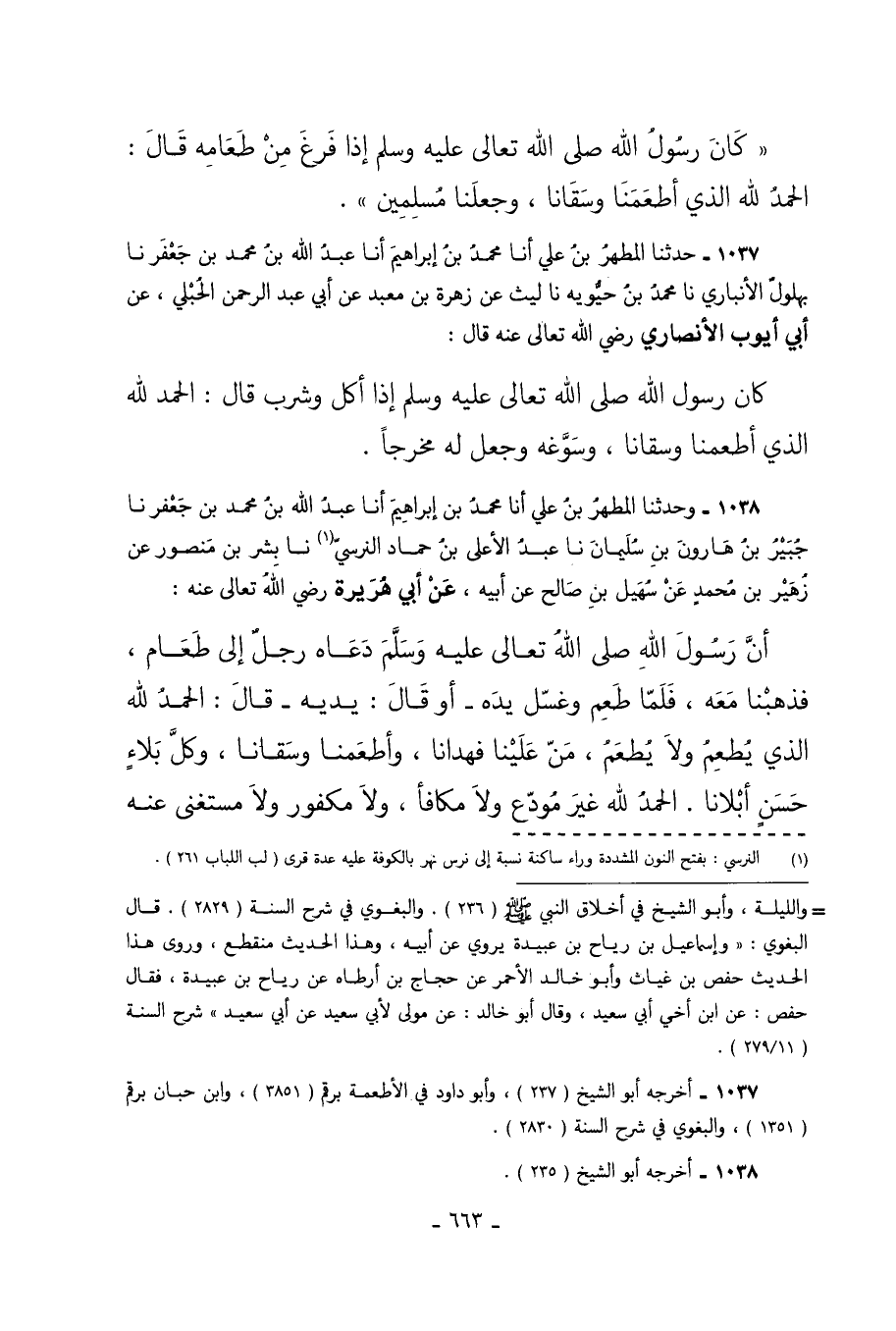1037 - حَدَّثَنَا الْمُطَهَّرُ بْنُ عَلِيٍّ أَنَا مُحَمَّدُ بْنُ إِبْرَاهِيمَ أَنَا عَبْدُ اللَّهِ بْنُ مُحَمَّدِ بْنِ جَعْفَرٍ نَا بُهْلُولٌ الأَنْبَارِيُّ نَا مُحَمَّدُ بْنُ حَيُّوَيْهِ نَا لَيْثٌ عَنْ زُهْرَةَ بْنِ مَعْبَدٍ عَنْ أَبِي عَبْدِ الرَّحْمَنِ الْحُبُلِيِّ عَنْ أَبِي أَيُّوبَ الأَنْصَارِيِّ رَضِيَ اللَّهُ تَعَالَى عَنْهُ قَالَ كَانَ رَسُولُ اللَّهِ صَلَّى اللَّهُ تَعَالَى عَلَيْهِ وَسَلَّمَ إِذَا أَكَلَ وَشَرِبَ قَالَ الْحَمْدُ لِلَّهِ الَّذِي أَطْعَمَنَا وَسَقَانَا وَسَوَّغَهُ وَجَعَلَ لَهُ مَخْرَجًا.