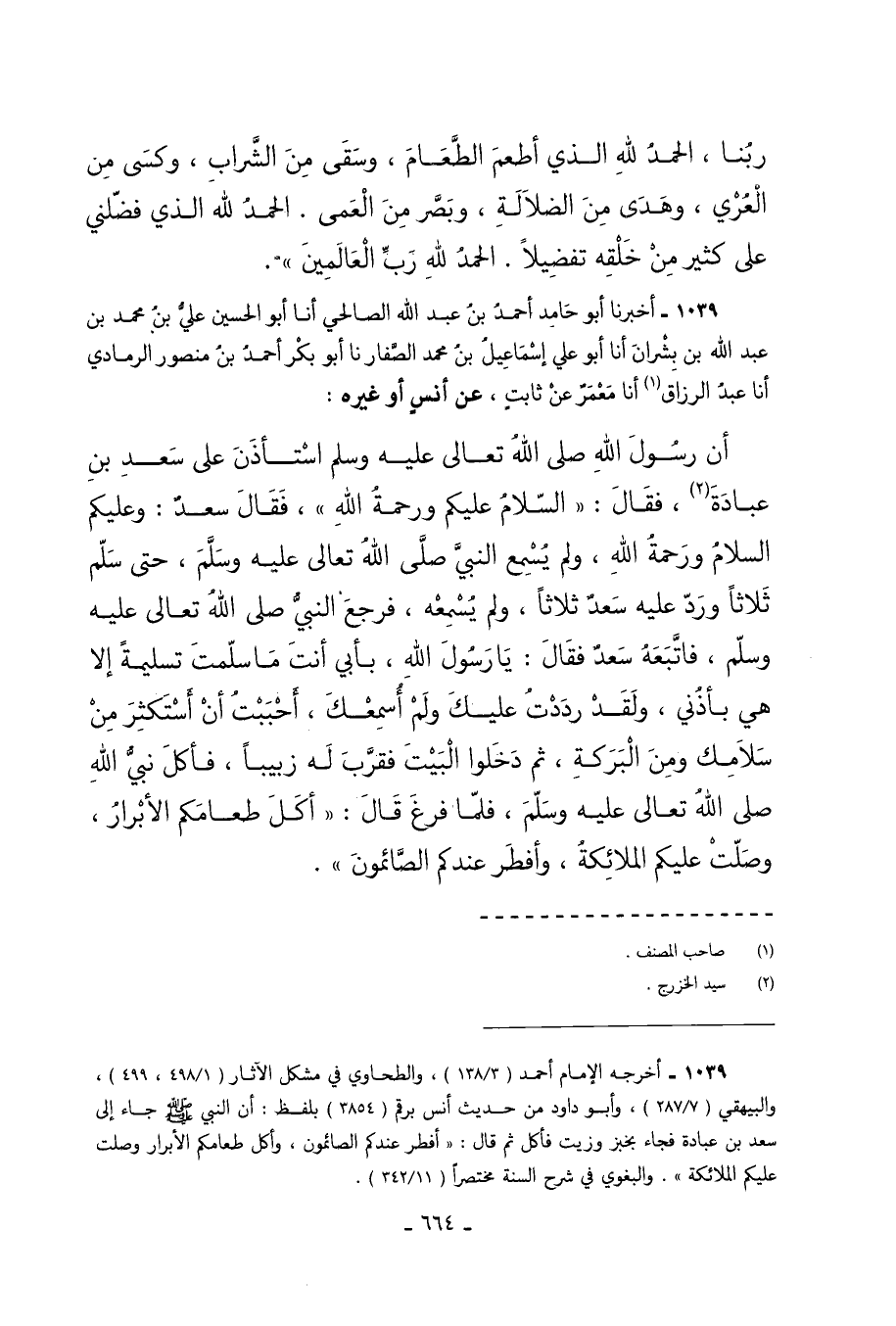 1039 - أَخْبَرَنَا أَبُو حَامِدٍ أَحْمَدُ بْنُ عَبْدِ اللَّهِ الصَّالِحِيُّ أَنَا أَبُو الْحُسَيْنِ عَلِيُّ بْنُ مُحَمَّدِ بْنِ عَبْدِ اللَّهِ بْنِ بِشْرَانَ أَنَا أَبُو عَلِيٍّ إِسْمَاعِيلُ بْنُ مُحَمَّدٍ الصَّفَّارُ نَا أَبُو بَكْرٍ أَحْمَدُ بْنُ مَنْصُورٍ الرَّمَادِيُّ أَنَا عَبْدُ الرَّزَّاقِ أَنَا مَعْمَرٌ عَنْ ثَابِتٍ عَنْ أَنَسٍ أَوْ غَيْرِهِ أَنَّ رَسُولَ اللَّهِ صَلَّى اللَّهُ تَعَالَى عَلَيْهِ وَسَلَّمَ اسْتَأْذَنَ عَلَى سَعْدِ بْنِ عُبَادَةَ فَقَالَ السَّلامُ عَلَيْكُمْ وَرَحْمَةُ اللَّهِ فَقَالَ سَعْدٌ وَعَلَيْكُمُ السَّلامُ وَرَحْمَةُ اللَّهِ وَلَمْ يُسْمِعِ النَّبِيَّ صَلَّى اللَّهُ تَعَالَى عَلَيْهِ وَسَلَّمَ حَتَّى سَلَّمَ ثَلاثًا وَرَدَّ عَلَيْهِ سَعْدٌ ثَلاثًا وَلَمْ يُسْمِعْهُ فَرَجَعَ النَّبِيُّ صَلَّى اللَّهُ تَعَالَى عَلَيْهِ وَسَلَّمَ فَاتَّبَعَهُ سَعْدٌ فَقَالَ يَا رَسُولَ اللَّهِ بِأَبِي أَنْتَ مَا سَلَّمْتَ تَسْلِيمَةً إِلا هِيَ بِأُذُنِي وَلَقَدْ رَدَدْتُ عَلَيْكَ وَلَمْ أُسْمِعْكَ أَحْبَبْتُ أَنْ أَسْتَكْثِرَ مِنْ سَلامِكَ وَمِنَ الْبَرَكَةِ ثُمَّ دَخَلُوا الْبَيْتَ فَقَرَّبَ لَهُ زَبِيبًا فَأَكَلَ نَبِيُّ اللَّهِ صَلَّى اللَّهُ تَعَالَى عَلَيْهِ وَسَلَّمَ فَلَمَّا فَرَغَ قَالَ أَكَلَ طَعَامَكُمُ الأَبْرَارُ وَصَلَّتْ عَلَيْكُمُ الْمَلائِكَةُ وَأَفْطَرَ عِنْدَكُمُ الصَّائِمُونَ.