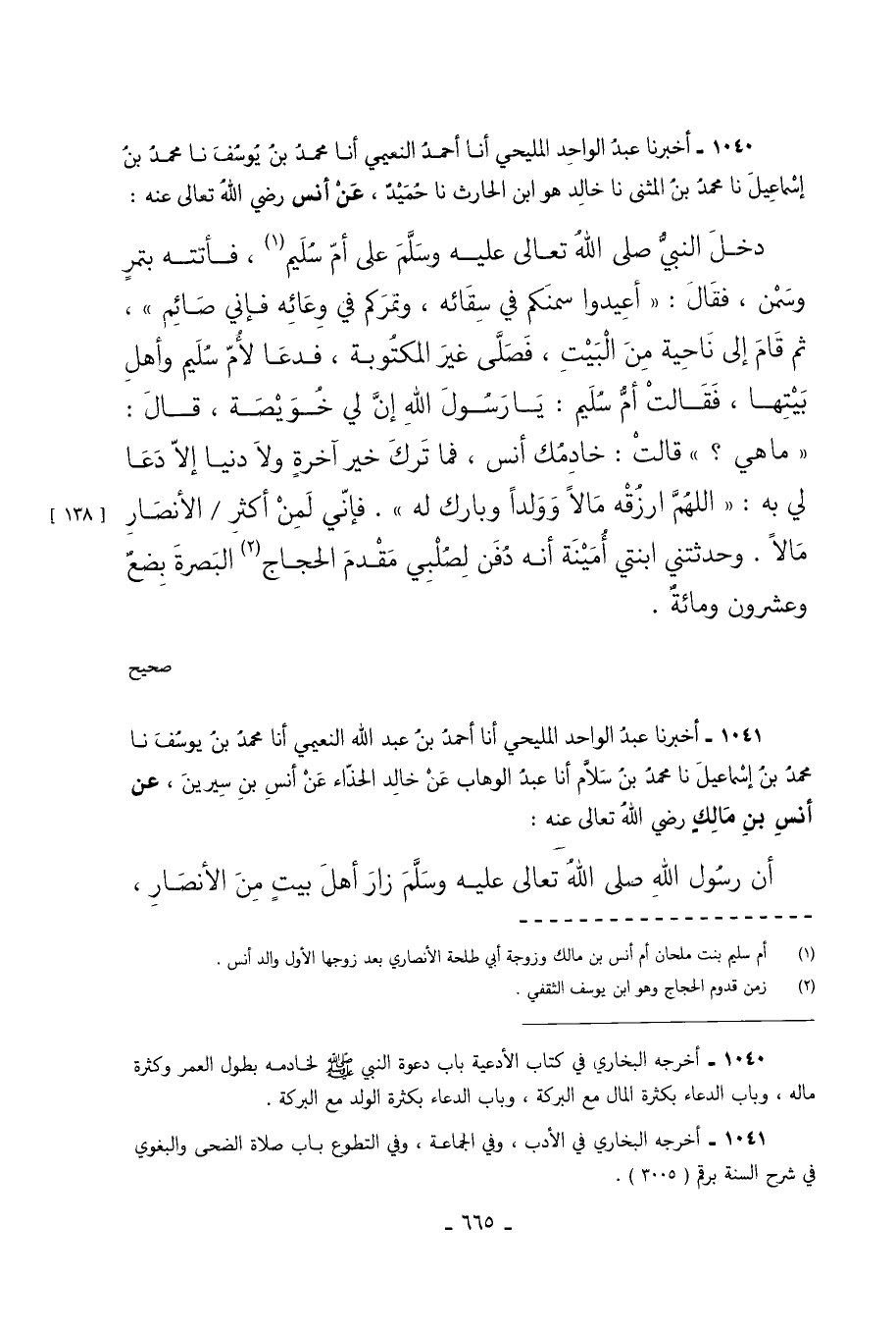 1040 - أَخْبَرَنَا عَبْدُ الْوَاحِدِ الْمَلِيحِيُّ أَنَا أَحْمَدُ النُّعَيْمِيُّ أَنَا مُحَمَّدُ بْنُ يُوسُفَ نَا مُحَمَّدُ بْنُ إِسْمَاعِيلَ نَا مُحَمَّدُ بْنُ الْمُثَنَّى نَا خَالِدٌ هُوَ ابْنُ الْحَارِثِ نَا حُمَيْدٌ عَنْ أَنَسٍ رَضِيَ اللَّهُ تَعَالَى عَنْهُ دَخَلَ النَّبِيُّ صَلَّى اللَّهُ تَعَالَى عَلَيْهِ وَسَلَّمَ عَلَى أُمِّ سُلَيْمٍ فَأَتَتْهُ بِتَمْرٍ وَسَمْنٍ فَقَالَ أَعِيدُوا سَمْنَكُمْ فِي سِقَائِهِ وَتَمْرَكُمْ فِي وِعَائِهِ فَإِنِّي صَائِمٌ ثُمَّ قَامَ إِلَى نَاحِيَةٍ مِنَ الْبَيْتِ فَصَلَّى غَيْرَ الْمَكْتُوبَةِ فَدَعَا لأُمِّ سُلَيْمٍ وَأَهْلِ بَيْتِهَا فَقَالَتْ أُمُّ سُلَيْمٍ يَا رَسُولَ اللَّهِ إِنَّ لِي خُوَيْصَةً قَالَ مَا هِيَ قَالَتْ خَادِمُكَ أَنَسٌ فَمَا تَرَكَ خَيْرَ آخِرَةٍ وَلا دُنْيَا إِلا دَعَا لِي بِهِ اللَّهُمَّ ارْزُقْهُ مَالا وَوَلَدًا وَبَارِكْ لَهُ فَإِنِّي لَمِنْ أَكْثَرِ الأَنْصَارِ مَالا وَحَدَّثَتْنِي ابْنَتِي أَمِينَةُ أَنَّهُ دُفِنَ لِصُلْبِي مَقْدَمَ الْحُجَّاجِ الْبَصْرَةَ بِضْعٌ وعشرون ومائة. صحيح