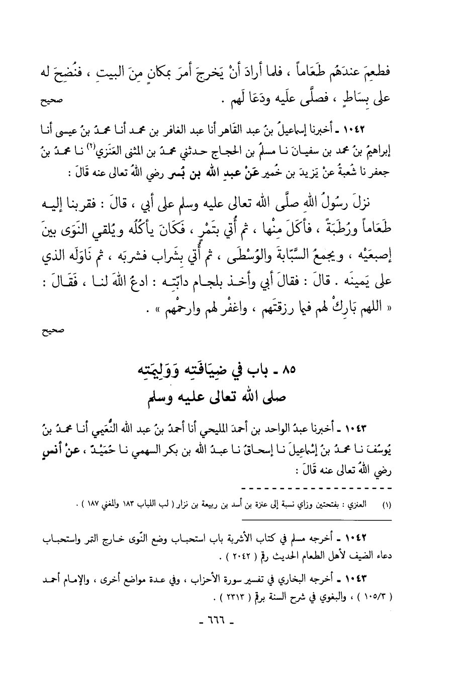 1042 - أَخْبَرَنَا إِسْمَاعِيلُ بْنُ عَبْدِ الْقَاهِرِ أَنَا عَبْدُ الْغَافِرِ بْنُ مُحَمَّدٍ أَنَا مُحَمَّدُ بْنُ عِيسَى أَنَا إِبْرَاهِيمُ بْنُ مُحَمَّدِ بْنِ سُفْيَانَ نَا مُسْلِمُ بْنُ الْحَجَّاجِ حَدَّثَنِي مُحَمَّدُ بْنُ الْمُثَنَّى الْعَنَزِيُّ نَا مُحَمَّدُ بْنُ جَعْفَرٍ نَا شُعْبَةُ عَنْ يَزِيدَ بْنِ خُمَيْرٍ عَنْ عَبْدِ اللَّهِ بْنِ بُسْرٍ رَضِيَ اللَّهُ تَعَالَى عَنْهُ قَالَ نَزَلَ رَسُولُ اللَّهِ صَلَّى اللَّهُ تَعَالَى عَلَيْهِ وَسَلَّمَ عَلَى أَبِي قَالَ فَقَرَّبْنَا إِلَيْهِ طَعَامًا وَرُطَبَةً فَأَكَلَ مِنْهَا ثُمَّ أُتِيَ بِتَمْرٍ فَكَانَ يَأْكُلُهُ وَيُلْقِي النَّوَى بَيْنَ إِصْبَعَيْهِ وَيَجْمَعُ السَّبَّابَةَ وَالْوُسْطَى ثُمَّ أُتِيَ بِشَرَابٍ فَشَرِبَهُ ثُمَّ نَاوَلَهُ الَّذِي عَلَى يَمِينِهِ قَالَ فَقَالَ أَبِي وَأَخَذَ بِلِجَامِ دَابَّتِهِ ادْعُ اللَّهَ لَنَا فَقَالَ اللَّهُمَّ بَارِكْ لَهُمْ فِيمَا رَزَقْتَهُمْ وَاغْفِرْ لهم وارحمهم. صحيح