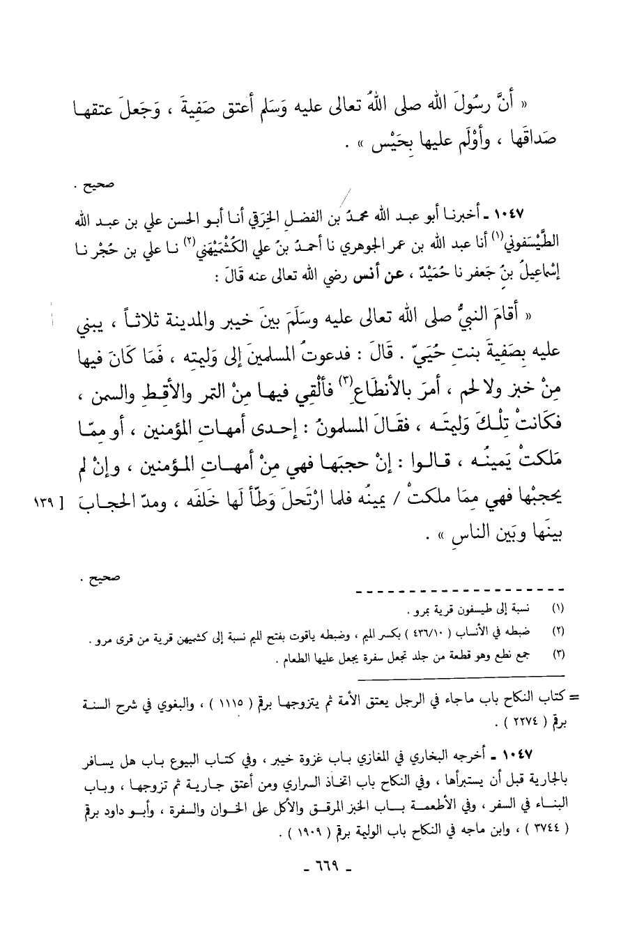 1047 - أَخْبَرَنَا أَبُو عَبْدِ اللَّهِ مُحَمَّدُ بْنُ الْفَضْلِ الْخِرَقِيُّ أَنَا أَبُو الْحَسَنِ عَلِيُّ بْنُ عَبْدِ اللَّهِ الطَّيْسَفُونِيُّ أَنَا عَبْدُ اللَّهِ بْنُ عُمَرَ الْجَوْهَرِيُّ نَا أَحْمَدُ بْنُ عَلِيٍّ الْكُشْمِيهَنِيُّ نَا عَلِيُّ بْنُ حُجْرٍ نَا إِسْمَاعِيلُ بْنُ جَعْفَرٍ نَا حُمَيْدٌ عَنْ أَنَسٍ رَضِيَ اللَّهُ تَعَالَى عَنْهُ قَالَ أَقَامَ النَّبِيُّ صَلَّى اللَّهُ تَعَالَى عَلَيْهِ وَسَلَّمَ بَيْنَ خَيْبَرَ وَالْمَدِينَةِ ثَلاثًا يُبْنَى عَلَيْهِ بِصَفِيَّةَ بِنْتِ حُيَيٍّ قَالَ فَدَعَوْتُ الْمُسْلِمِينَ إِلَى وَلِيمَتِهِ فَمَا كَانَ فِيهَا مِنْ خِبْزٍ وَلا لَحْمٍ أُمِرَ بِالأَنْطَاعِ فَأُلْقِيَ فِيهَا مِنَ التَّمْرِ وَالأَقِطِ وَالسَّمْنِ فَكَانَتْ تِلْكَ وَلِيمَتَهُ فَقَالَ الْمُسْلِمُونَ إِحْدَى أُمَّهَاتِ الْمُؤْمِنِينَ أَوْ مِمَّا مَلَكَتْ يَمِينُهُ قَالُوا إِنْ حَجَبَهَا فَهِيَ مِنْ أُمَّهَاتِ الْمُؤْمِنِينَ وَإِنْ لَمْ يَحْجُبْهَا فَهِيَ مِمَّا مَلَكَتْ يَمِينُهُ فَلَمَّا ارْتَحَلَ وَطَّأَ لَهَا خَلْفَهُ وَمَدَّ الْحِجَابَ بَيْنَهَا وبين الناس. صحيح