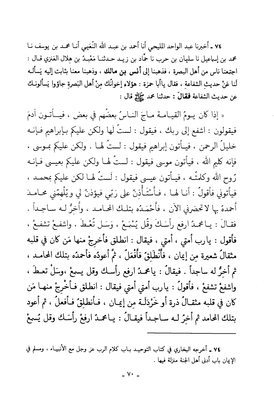 74 - أَخْبَرَنَا عَبْدُ الْوَاحِدِ الْمَلِيحِيُّ أَنَا أَحْمَدُ بْنُ عَبْدِ اللَّهِ النُّعَيْمِيُّ أَنَا مُحَمَّدُ بْنُ يُوسُفَ نا مُحَمَّدُ بْنُ إِسْمَاعِيلَ نا سُلَيْمَانُ بْنُ حَرْبٍ نا حَمَّادُ بْنُ زَيْدٍ حَدَّثَنَا مَعْبَدُ بْنُ هِلالٍ الْعَنَزِيُّ قَالَ اجْتَمَعْنَا نَاسٌ مِنْ أَهْلِ الْبَصْرَةِ فَذَهَبْنَا إِلَى أَنَسِ بْنِ مَالِكٍ وَذَهَبْنَا مَعَنَا بِثَابِتٍ إِلَيْهِ يَسْأَلُهُ لَنَا عَنْ حَدِيثِ الشَّفَاعَةِ فَقَالَ يَا أَبَا حَمْزَةَ هَؤُلاءِ إِخْوَانُكَ مِنْ أهل البصرة جاؤوا يَسْأَلُونَكَ عَنْ حَدِيثِ الشَّفَاعَةِ فَقَالَ حَدَّثَنَا مُحَمَّدٌ صَلَّى اللهُ عَلَيْهِ وَسَلَّمَ قَالَ إِذَا كَانَ يَوْمُ الْقِيَامَةِ مَاجَ النَّاسُ بَعْضُهُمْ فِي بَعْضٍ فَيَأْتُونَ آدَمَ فَيَقُولُونَ اشْفَعْ إِلَى رَبِّكَ فَيَقُولُ لَسْتُ لَهَا وَلَكِنْ عَلَيْكُمْ بِإِبْرَاهِيمَ فَإِنَّهُ خَلِيلُ الرَّحْمَنِ فَيَأْتُونَ إِبْرَاهِيمَ فَيَقُولُ لَسْتُ لَهَا وَلَكِنْ عَلْيُكْم بِمُوسَى فَإِنَّهُ كَلِيمُ اللَّهِ فَيَأْتُونَ مُوسَى فَيَقُولُ لَسْتُ لَهَا وَلَكِنْ عَلَيْكُمْ بِعِيسَى فَإِنَّهُ رُوحُ اللَّهِ وَكَلِمَتُهُ فَيَأْتُونَ عِيسَى فَيَقُولُ لَسْتُ لَهَا لَكِنْ عَلَيْكُمْ بِمُحَمَّدٍ فَيَأْتُونِي فَأَقُولُ أَنَا لَهَا فَأَسْتَأْذِنُ عَلَى رَبِّيَ فَيُؤْذَنُ لِي وَيُلْهِمُنِي مَحَامِدَ أَحْمَدُهُ بِهَا لا تَحْضُرُنِي الآنَ فَأَحْمَدُهُ بِتِلْكَ الْمَحَامِدِ وَأَخِرُّ لَهُ سَاجِدًا فَقَالَ يَا مُحَمَّدُ ارْفَعْ رَأْسَكَ وَقُلْ يُسْمَعْ وَسَلْ تُعْطَ وَاشْفَعْ تُشَفَّعْ فَأَقُولُ يَا رَبِّ أُمَّتِي أُمَّتِي فَيُقَالُ انْطَلِقْ فَأَخْرِجْ مِنْهَا مَنْ كَانَ فِي قَلْبِهِ مِثْقَالُ شَعِيرَةٍ مِنْ إِيمَانٍ فَأَنْطَلِقُ فَأَفْعَلُ ثُمَّ أَعُودُهُ فَأَحْمَدُهُ بِتِلْكَ الْمَحَامِدِ ثُمَّ أَخِرُّ لَهُ سَاجِدًا فَيُقَالُ يَا مُحَمَّدُ ارْفَعْ رَأْسَكَ وَقُلْ يُسْمَعْ وَسَلْ تُعْطَ وَاشْفَعْ تشفع فأقول يا رب أُمَّتِي أُمَّتِي فَيُقَالَ انْطَلِقْ فَأَخْرِجْ مِنْهَا مِنْ كَانَ فِي قَلْبِهِ مِثْقَالُ ذَرَّةٍ أَوْ خَرْدَلَةٍ مِنْ إِيمَانٍ فَأَنْطَلِقُ فَأَفْعَلُ ثُمَّ أَعُودُ بِتِلْكَ الْمَحَامِدِ ثُمَّ أَخِرُّ لَهُ سَاجِدًا فَيُقَالُ يَا مُحَمَّدُ ارْفَعْ رَأْسَكَ وَقُلْ يُسْمَعْ وَسَلْ