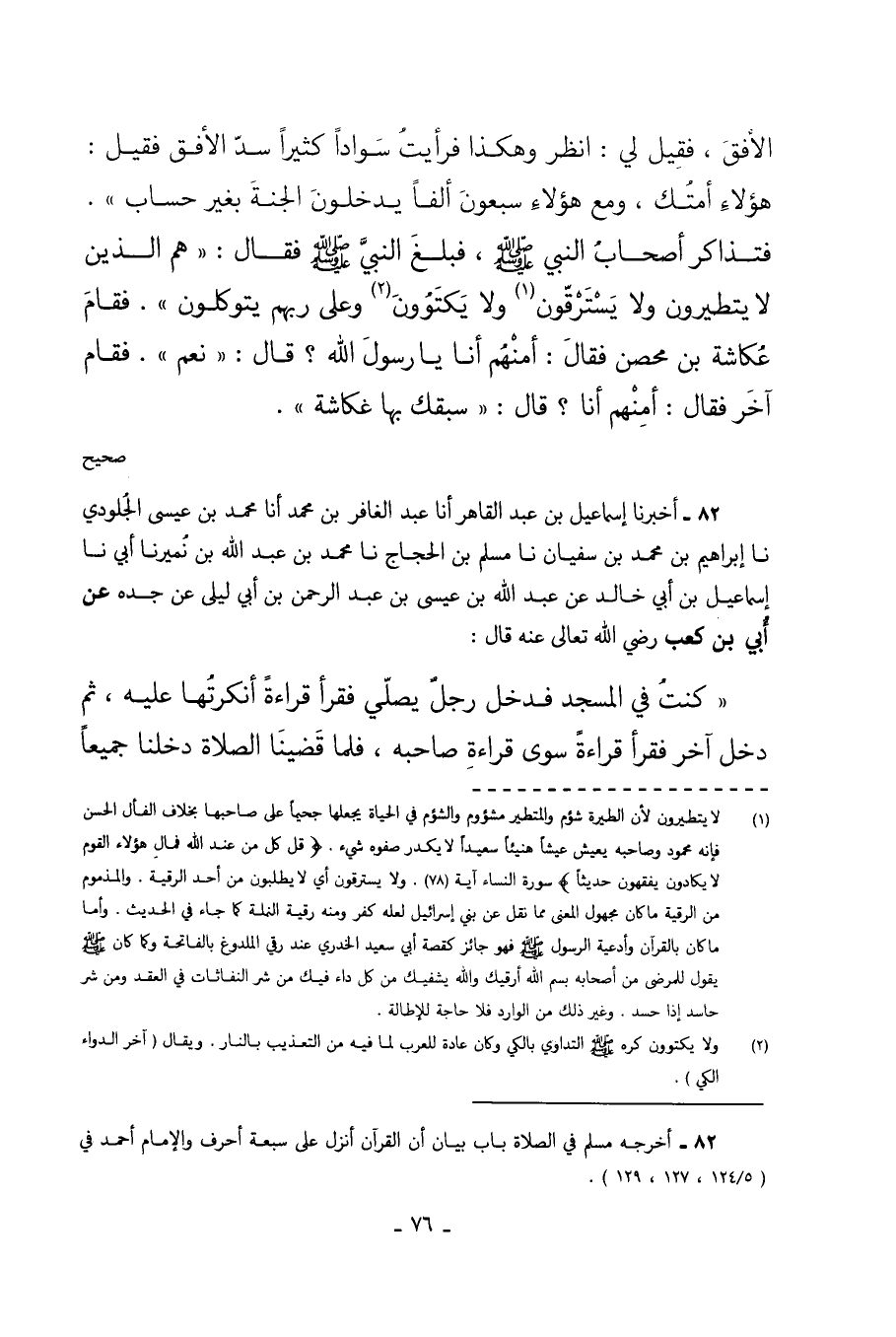 الأُفُقَ فَقِيلَ لِي انْظُرْ وَهَكَذَا فَرَأَيْتُ سَوَادًا كَثِيرًا سَدَّ الأُفُقَ فَقِيلَ هَؤُلاءِ أُمَّتُكَ وَمَعَ هَؤُلاءِ سَبْعُونَ أَلْفًا يَدْخُلُونَ الْجَنَّةَ بِغَيْرِ حِسَابٍ فَتَذَاكَرَ أَصْحَابُ النَّبِيِّ صَلَّى اللهُ عَلَيْهِ وَسَلَّمَ فَبَلَغَ النَّبِيَّ صَلَّى اللهُ عَلَيْهِ وَسَلَّمَ فَقَالَ هُمُ الَّذِينَ لا يَتَطَيَّرُونَ وَلا يَسْتَرْقُونَ وَلا يَكْتَوُونَ وَعَلَى رَبِّهِمْ يَتَوَكَّلُونَ فَقَامَ عُكَّاشَةُ بْنُ مِحْصَنٍ فَقَالَ أَمِنْهُمْ أَنَا يَا رَسُولَ اللَّهِ قَالَ نَعَمْ فَقَامَ آخَرُ فَقَالَ أَمِنْهُمْ أَنَا قَالَ سَبَقَكَ بها عكاشة. صحيح