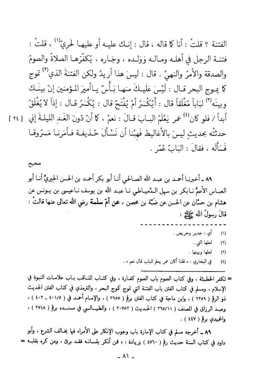 الْفِتْنَةِ قُلْتُ أَنَا كَمَا قَالَهُ قَالَ إِنَّكَ عَلَيْهِ أَوْ عَلَيْهَا لَحَرِيٌّ قُلْتُ فِتْنَةُ الرَّجُلِ فِي أَهْلِهِ وَمَالِهِ وَوَلَدِهِ وَجَارِهِ يُكَفِّرُهَا الصَّلاةُ وَالصَّوْمُ وَالصَّدَقَةُ وَالْأَمْرُ وَالنَّهْيُ قَالَ لَيْسَ هَذَا أُرِيدُ ولكن الفتنة الذي تَمُوجُ كَمَا يَمُوجُ الْبَحْرُ قَالَ لَيْسَ عَلَيْكَ مِنْهَا بَأْسٌ يَا أَمِيرَ الْمُؤْمِنِينَ إن بينك وبينه لَبَابًا مُغْلَقًا قَالَ أَيُكْسَرُ أَمْ يُفْتَحُ قَالَ يُكْسَرُ قَالَ إِذًا لا يُغْلَقُ أَبَدًا فَلَوْ كَانَ عُمَرُ يَعْلَمُ الْبَابَ قَالَ نَعَمْ كَمَا أَنَّ دُونَ الْغَدِ اللَّيْلَةَ إِنِّي حَدَّثْتُهُ بِحَدِيثٍ لَيْسَ بِالأَغَالِيطِ فَهِبْنَا أَنْ نَسْأَلَ حُذَيْفَةَ فَأَمَرْنَا مَسْرُوقًا فَسَأَلَهُ فَقَالَ الباب عمر. صحيح
