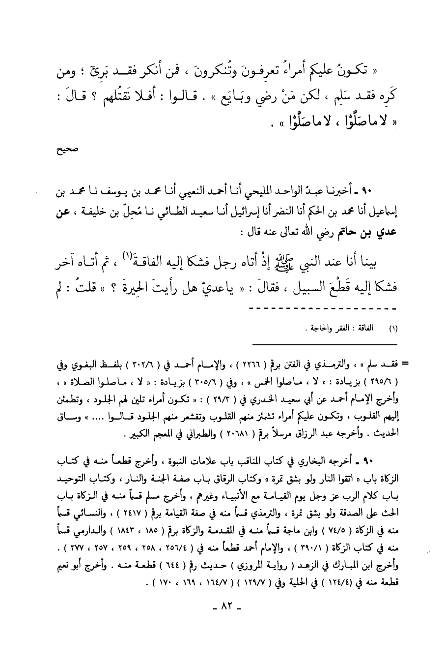 90 - أَخْبَرَنَا عَبْدُ الْوَاحِدِ الْمَلِيحِيُّ أَنَا أَحْمَدُ النُّعَيْمِيُّ أَنَا مُحَمَّدُ بْنُ يُوسُفَ نا مُحَمَّدُ بْنُ إِسْمَاعِيلَ أَنَا مُحَمَّدُ بْنُ الْحَكَمِ أَنَا النَّضْرُ أَنَا إِسْرَائِيلُ أَنَا سَعِيدُ الطَّائِيُّ نا مُحِلُّ بْنُ خَلِيفَةَ عَنْ عَدِيِّ بْنِ حَاتِمٍ رَضِيَ اللَّهُ تَعَالَى عَنْهُ قَالَ بَيْنَا أَنَا عِنْدَ النَّبِيِّ صَلَّى اللهُ عَلَيْهِ وَسَلَّمَ إِذْ أَتَاهُ رَجُلٌ فَشَكَا إِلَيْهِ الْفَاقَةَ ثُمَّ أَتَاهُ آخَرُ فَشَكَا إِلَيْهِ قَطْعَ السَّبِيلِ فَقَالَ يَا عَدِيُّ هَلْ رَأَيْتَ الْحِيرَةَ قُلْتُ لَمْ