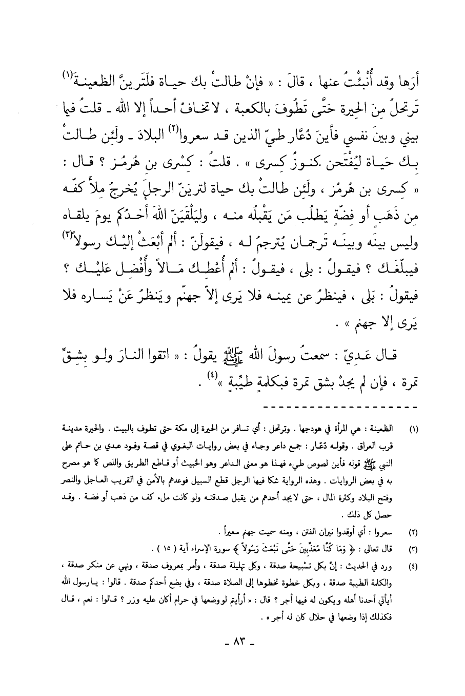 أَرَهَا وَقَدْ أُنْبِئْتُ عَنْهَا قَالَ فَإِنْ طَالَتْ بِكَ حَيَاةٌ فَلَتَرَيَنَّ الظَّعِينَةَ تَرْتَحِلُ مِنَ الْحِيرَةِ حَتَّى تَطُوفَ بِالْكَعْبَةِ لا تَخَافُ أَحَدًا إِلا اللَّهَ قُلْتُ فِيمَا بَيْنِي وَبَيْنَ نَفْسِي فأين دعار طي الذي قَدْ سَعَّرُوا الْبِلادَ وَلَئِنْ طَالَتْ بِكَ حَيَاةٌ لَيُفْتَحَنَّ كُنُوزُ كِسْرَى قُلْتُ كِسْرَى بْنُ هُرْمُزَ قَالَ كِسْرَى بْنُ هُرْمُزَ وَلَئِنْ طَالَتْ بِكَ حَيَاةٌ لَتَرَيَنَّ الرجل يخرج ملأ كفله مِنْ ذَهَبٍ أَوْ فِضَّةٍ يَطْلُبُ مَنْ يَقْبَلُهُ مِنْهُ وَلَيَلْقَيَنَّ اللَّهَ أَحَدُكُمْ يَوْمَ يَلْقَاهُ وَلَيْسَ بَيْنَهُ وَبَيْنَهُ تَرْجُمَانٌ يُتَرْجِمُ لَهُ فَيَقُولَنَّ أَلَمْ أَبْعَثْ إِلَيْكَ رَسُولا فَيُبَلِّغُكَ فَيَقُولُ بَلَى فَيَقُولُ أَلَمْ أُعْطِكَ مَالا وَأُفْضِلَ عَلَيْكَ فَيَقُولُ بَلَى فَيَنْظُرُ عَنْ يَمِينِهِ فَلا يَرَى إِلا جَهَنَّمَ وَيَنْظُرُ عَنْ يَسَارِهِ فَلا يَرَى إِلا جَهَنَّمَ قَالَ عَدِيٌّ سَمِعْتُ رَسُول اللَّهِ صَلَّى اللهُ عَلَيْهِ وَسَلَّمَ يَقُولُ اتَّقُوا النَّارَ وَلَوْ بِشِقِّ تَمْرَةٍ فَإِنْ لَمْ يَجِدْ بِشِقِّ تَمْرَةٍ فَبِكَلِمَةٍ طَيِّبَةٍ