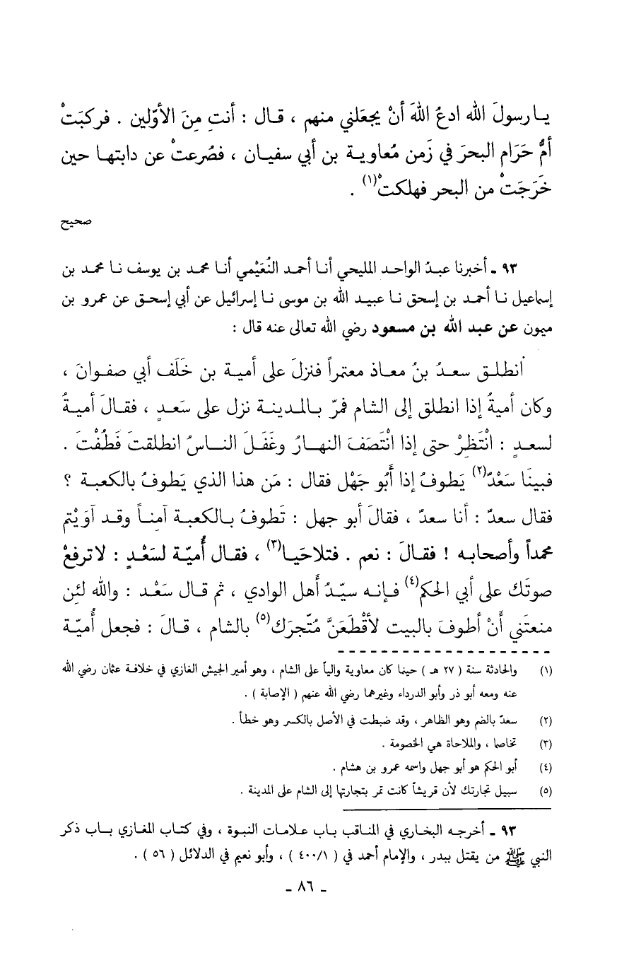 93 - أَخْبَرَنَا عَبْدُ الْوَاحِدِ الْمَلِيحِيُّ أَنَا أَحْمَدُ النُّعَيْمِيُّ أَنَا مُحَمَّدُ بْنُ يُوسُفَ نا مُحَمَّدُ بْنُ إِسْمَاعِيلَ نا أحمد بن إسحق نا عُبَيْدُ اللَّهِ بْنُ مُوسَى نا إِسْرَائِيلُ عن أبي إسحق عَنْ عَمْرِو بْنِ مَيْمُونٍ عَنْ عَبْدِ اللَّهِ بْنِ مَسْعُودٍ رَضِيَ اللَّهُ تَعَالَى عَنْهُ قَالَ انْطَلَقَ سَعْدُ بْنُ مُعَاذٍ مُعْتَمِرًا فَنَزَلَ عَلَى أُمَيَّةَ بْنِ خَلَفٍ أَبِي صَفْوَانَ وَكَانَ أُمَيَّةُ إِذَا انْطَلَقَ إِلَى الشَّامِ فَمَرَّ بِالْمَدِينَةِ نَزَلَ عَلَى سَعْدٍ فَقَالَ أُمَيَّةُ لِسَعْدٍ انْتَظِرْ حَتَّى إِذَا انْتَصَفَ النَّهَارُ وَغَفَلَ النَّاسُ انْطَلَقْتَ فَطُفْتَ فَبَيْنَا سَعْدٌ يَطُوفُ إِذَا أَبُو جَهْلٍ فَقَالَ مَنْ هَذَا الَّذِي يَطُوفُ بِالْكَعْبَةِ فَقَالَ سَعْدٌ أَنَا سَعْدٌ فَقَالَ أَبُو جَهْلٍ تَطُوفُ بِالْكَعْبَةِ آمِنًا وَقَدْ آوَيْتُمْ مُحَمَّدًا وَأَصْحَابَهُ فَقَالَ نَعَمْ فَتَلاحَيَا فَقَالَ أُمَيَّةُ لِسَعْدٍ لا تَرْفَعْ صَوْتَكَ عَلَى أَبِي الْحَكَمِ فَإِنَّهُ سَيِّدُ أَهْلِ الْوَادِي ثُمَّ قَالَ سَعْدٌ وَاللَّهِ لَئِنْ مَنَعْتَنِي أَنْ أَطُوفَ بِالْبَيْتِ لأقْطَعَنَّ مَتْجَرَكَ بِالشَّامِ قَالَ فَجَعَلَ أُمَيَّةُ
