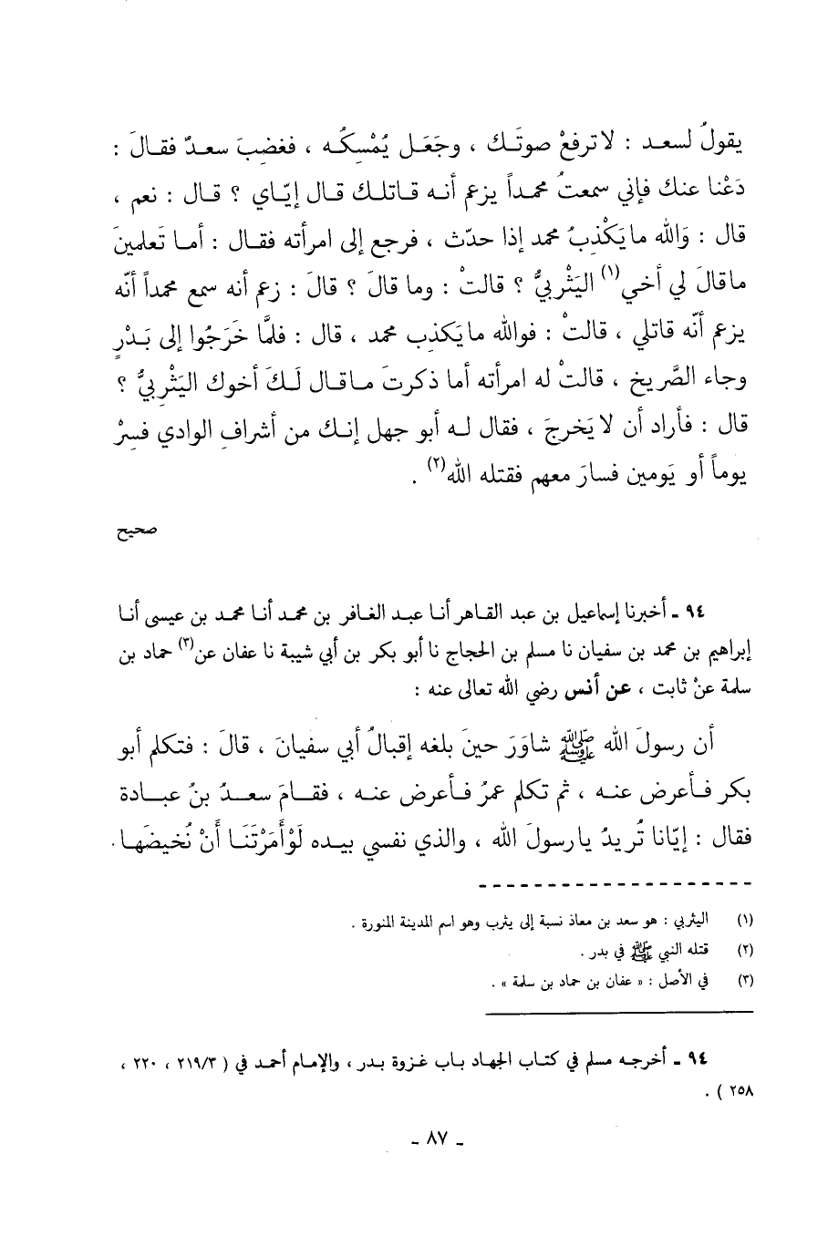 94 - أَخْبَرَنَا إِسْمَاعِيلُ بْنُ عَبْدِ الْقَاهِرِ أَنَا عَبْدُ الْغَافِرِ بْنُ مُحَمَّدٍ أَنَا مُحَمَّدُ بْنُ عِيسَى أَنَا إِبْرَاهِيمُ بْنُ مُحَمَّدِ بْنِ سُفْيَانَ نا مُسْلِمُ بْنُ الْحَجَّاجِ نا أَبُو بَكْرِ بْنُ أَبِي شَيْبَةَ نا عَفَّانُ عَنْ حَمَّادِ بْنِ سَلَمَةَ عَنْ ثَابِتٍ عَنْ أَنَسٍ رَضِيَ اللَّهُ تَعَالَى عَنْهُ أَنَّ رَسُولَ اللَّهِ صَلَّى اللهُ عَلَيْهِ وَسَلَّمَ شَاوَرَ حِينَ بَلَغَهُ إِقْبَالُ أَبِي سُفْيَانَ قَالَ فَتَكَلَّمَ أَبُو بَكْرٍ فَأَعْرَضَ عَنْهُ ثُمَّ تَكَلَّمَ عُمَرُ فَأَعْرَضَ عَنْهُ فَقَامَ سَعْدُ بْنُ عُبَادَةَ فَقَالَ إِيَّانَا تُرِيدُ يَا رَسُولَ اللَّهِ وَالَّذِي نَفْسِي بِيَدِهِ لَوْ أَمَرْتَنَا أَنْ نُخِيضَهَا