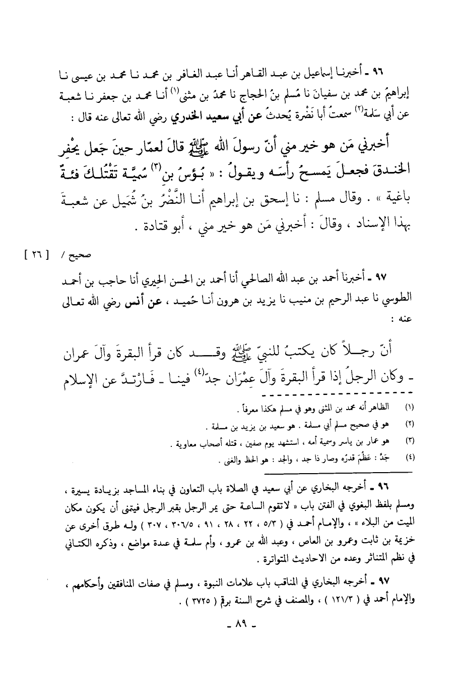 96 - أَخْبَرَنَا إِسْمَاعِيلُ بْنُ عَبْدِ الْقَاهِرِ أَنَا عَبْدُ الْغَافِرِ بْنُ مُحَمَّدٍ نا مُحَمَّدُ بْنُ عِيسَى نا إِبْرَاهِيمُ بْنُ مُحَمَّدِ بْنِ سُفْيَانَ نا مُسْلِمُ بْنُ الْحَجَّاجِ نا مُحَمَّدُ بْنُ مُثَنَّى أَنَا مُحَمَّدُ بْنُ جَعْفَرٍ نا شُعْبَةُ عَنْ أَبِي سَلَمَةَ سَمِعْتُ أَبَا نَضْرَةَ يُحَدِّثُ عَنْ أَبِي سَعِيدٍ الْخُدْرِيِّ رَضِيَ اللَّهُ تَعَالَى عَنْهُ قَالَ أَخْبَرَنِي مَنْ هُوَ خَيْرٌ مِنِّي أَنَّ رَسُولَ اللَّهِ صَلَّى اللهُ عَلَيْهِ وَسَلَّمَ قَالَ لِعَمَّارٍ حِينَ جَعَلَ يَحْفُرُ الْخَنْدَقَ فَجَعَلَ يَمْسَحُ رَأْسَهُ وَيَقُولُ بُؤْسُ بن سُمَيَّةَ تقتلك فئة باغبة وَقَالَ مسلم نا إسحق بْنُ إِبْرَاهِيمَ أَنَا النَّضْرُ بْنُ شُمَيْلٍ عَنْ شُعْبَةَ بِهَذَا الإِسْنَادِ وَقَالَ أَخْبَرَنِي مِنْ هُوَ خَيْرٌ مِنِّي أبو قتادة. صحيح
