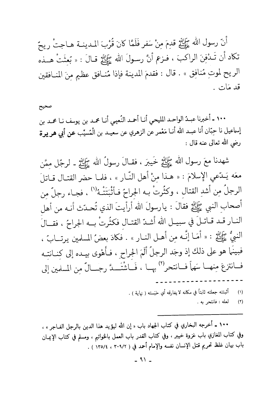 100 - أَخْبَرَنَا عَبْدُ الْوَاحِدِ الْمَلِيحِيُّ أَنَا أَحْمَدُ النُّعَيْمِيُّ أَنَا مُحَمَّدُ بْنُ يُوسُفَ نا مُحَمَّدُ بْنُ إِسْمَاعِيلَ نا حِبَّانُ أَنَا عَبْدُ اللَّهِ أَنَا مَعْمَرٌ عَنِ الزُّهْرِيِّ عَنْ سَعِيدِ بْنِ الْمُسَيِّبِ عَنْ أَبِي هُرَيْرَةَ رَضِيَ اللَّهُ تَعَالَى عَنْهُ قَالَ شَهِدْنَا مَعَ رَسُولِ اللَّهِ صَلَّى اللهُ عَلَيْهِ وَسَلَّمَ خَيْبَرَ فَقَالَ رَسُول اللَّهِ صَلَّى اللهُ عَلَيْهِ وَسَلَّمَ لِرَجُلٍ مِمَّنْ مَعَهُ يَدَّعِي الإِسْلامَ هَذَا مِنْ أَهْلِ النَّارِ فَلَمَّا حَضَرَ الْقِتَالُ قَاتَلَ الرَّجُلُ مِنْ أَشَدِّ الْقِتَالِ وَكَثُرَتْ بِهِ الْجِرَاحُ فَأَثْبَتَتْهُ فَجَاءَ رَجُلٌ مِنْ أَصْحَابِ النَّبِيِّ صَلَّى اللهُ عَلَيْهِ وَسَلَّمَ فَقَالَ يَا رَسُولَ اللَّهِ أَرَأَيْتَ الَّذِي تُحَدِّثُ أَنَّهُ مِنْ أَهْلِ النَّارِ قَدْ قَاتَلَ فِي سَبِيلِ اللَّهِ أَشَدَّ الْقِتَالِ فَكَثُرَتْ بِهِ الْجِرَاحُ فَقَالَ النَّبِيُّ صَلَّى اللهُ عَلَيْهِ وَسَلَّمَ أَمَا إِنَّهُ مِنْ أَهْلِ النَّارِ فَكَادَ بَعْضُ الْمُسْلِمِينَ يَرْتَابُ فَبَيْنَمَا هُوَ عَلَى ذَلِكَ إِذْ وَجَدَ الرَّجُلُ أَلَمَ الْجِرَاحِ فَأَهْوَى بِيَدِهِ إِلَى كِنَانَتِهِ فَانْتَزَعَ مِنْهَا سَهْمًا فَانْتَحَرَ بِهَا فَاشْتَدَّ رِجَالٌ مِنَ الْمُسْلِمِينَ إِلَى