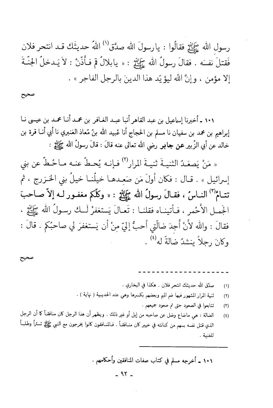 101 - أَخْبَرَنَا إِسْمَاعِيلُ بْنُ عَبْدِ الْقَاهِرِ أَنْبَا عَبْدُ الْغَافِرِ بْنُ مُحَمَّدٍ أَنَا مُحَمَّدُ بْنُ عِيسَى نا إِبْرَاهِيمُ بْنُ مُحَمَّدِ بْنِ سُفْيَانَ نا مُسْلِمُ بْنُ الْحَجَّاجِ أَنَا عُبَيْدُ اللَّهِ بْنُ مُعَاذٍ الْعَنْبَرِيُّ نا أَبِي أَنَا قُرَّةُ بْنُ خَالِدٍ عَنْ أَبِي الزُّبَيْرِ عَنْ جَابِرٍ رَضِيَ اللَّهُ تَعَالَى عَنْهُ قَالَ قَالَ رَسُولُ اللَّهِ صَلَّى اللهُ عَلَيْهِ وَسَلَّمَ مَنْ يَصْعَدُ الثَّنِيَّةَ ثَنِيَّةَ الْمُرَارِ فَإِنَّهُ يُحَطُّ عَنْهُ مَا حُطَّ عَنْ بَنِي إِسْرَائِيلَ قَالَ فَكَانَ أَوَّلَ مَنْ صَعِدَهَا خَيْلُنَا خَيْلُ بَنِي الْخَزْرَجِ ثُمَّ تَتَامَّ النَّاسُ فَقَالَ رَسُول اللَّهِ صَلَّى اللهُ عَلَيْهِ وَسَلَّمَ وَكُلُّكُمْ مَغْفُورٌ لَهُ إِلا صَاحِبَ الْجَمَلِ الأَحْمَرِ فَأَتَيْنَاهُ فَقُلْنَا تَعَالَ يَسْتَغْفِرْ لَكَ رَسُولُ اللَّهِ صَلَّى اللهُ عَلَيْهِ وَسَلَّمَ فَقَالَ وَاللَّهِ لأَنْ أَجِدَ ضَالَّتِي أَحَبُّ إِلَيَّ مِنْ أَنْ يَسْتَغْفِرَ لِي صَاحِبُكُمْ قَالَ وَكَانَ رَجُلا يَنْشُدُ ضَالَّةً لَهُ.