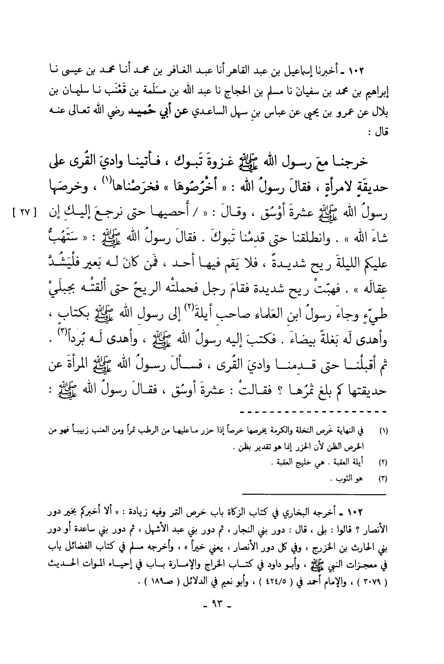 102 - أَخْبَرَنَا إِسْمَاعِيلُ بْنُ عَبْدِ الْقَاهِرِ أَنَا عَبْدُ الْغَافِرِ بْنُ مُحَمَّدٍ أَنَا مُحَمَّدُ بْنُ عِيسَى نا إِبْرَاهِيمُ بْنُ مُحَمَّدِ بْنِ سُفْيَانَ نا مُسْلِمُ بْنُ الْحَجَّاجِ نا عَبْدُ اللَّهِ بْنُ مَسْلَمَةَ بْنِ قَعْنَبٍ نا سُلَيْمَانُ بْنُ بِلالٍ عَنْ عَمْرِو بْنِ يَحْيَى عَنْ عَبَّاسِ بْنِ سَهْلٍ السَّاعِدِيِّ عَنْ أَبِي حُمَيْدٍ رَضِيَ اللَّهُ تَعَالَى عَنْهُ قَالَ خَرَجْنَا مَعَ رَسُولِ اللَّهِ صَلَّى اللهُ عَلَيْهِ وَسَلَّمَ غَزْوَةَ تَبُوكَ فَأَتَيْنَا وَادِي الْقُرَى عَلَى حَدِيقَةٍ لامْرَأَةٍ فَقَالَ رَسُولُ اللَّهِ اخْرُصُوهَا فَخَرَصْنَاهَا وَخَرَصَهَا رَسُولُ اللَّهِ صَلَّى اللهُ عَلَيْهِ وَسَلَّمَ عَشَرَةَ أَوْسُقٍ وَقَالَ أَحْصِيهَا حَتَّى نَرْجِعَ إِلَيْكَ إِنْ شَاءَ اللَّهُ وَانْطَلَقْنَا حَتَّى قَدِمْنَا تَبُوكَ فَقَالَ رَسُولُ اللَّهِ صَلَّى اللهُ عَلَيْهِ وَسَلَّمَ سَتَهُبُّ عَلَيْكُمُ اللَّيْلَةَ رِيحٌ شَدِيدَةٌ فَلا يَقُمْ فِيهَا أَحَدٌ فَمَنْ كَانَ لَهُ بَعِيرٌ فَلْيَشُدَّ عِقَالَهُ فَهَبَّتْ رِيحٌ شَدِيدَةٌ فَقَامَ رَجُلٌ فَحَمَلَتْهُ الرِّيحُ حَتَّى أَلْقَتْهُ بِجَبَلَيْ طَيِّءٍ وَجَاءَ رَسُولُ ابْنِ الْعُلَمَاءِ صَاحِبِ أَيْلَةَ إِلَى رَسُولِ اللَّهِ صَلَّى اللهُ عَلَيْهِ وَسَلَّمَ بِكِتَابٍ وَأَهْدَى لَهُ بَغْلَةً بَيْضَاءَ فَكَتَبَ إِلَيْهِ رَسُولُ اللَّهِ صَلَّى اللهُ عَلَيْهِ وَسَلَّمَ وَأَهْدَى لَهُ بُرْدًا ثُمَّ أَقْبَلْنَا حَتَّى قَدِمْنَا وَادِيَ الْقُرَى فَسَأَلَ رَسُولُ اللَّهِ صَلَّى اللهُ عَلَيْهِ وَسَلَّمَ الْمَرْأَةَ عَنْ حَدِيقَتِهَا كَمْ بَلَغَ ثَمَرُهَا فَقَالَتْ عَشَرَةَ أَوْسُقٍ فَقَالَ رَسُولُ اللَّهِ صَلَّى اللهُ عَلَيْهِ وَسَلَّمَ: