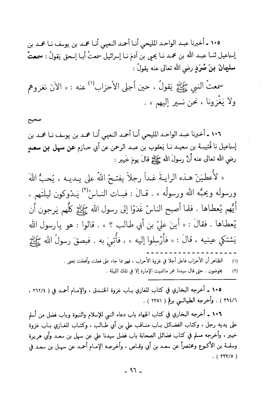 106 - أَخْبَرَنَا عَبْدُ الْوَاحِدِ الْمَلِيحِيُّ أَنَا أَحْمَدُ النُّعَيْمِيُّ أَنَا مُحَمَّدُ بْنُ يُوسُفَ نا مُحَمَّدُ بْنُ إِسْمَاعِيلَ نا قُتَيْبَةُ بْنُ سَعِيدٍ نا يَعْقُوبُ بْنُ عَبْدِ الرَّحْمَنِ عَنْ أَبِي حَازِمٍ عَنْ سَهْلِ بْنِ سَعْدٍ رَضِيَ اللَّهُ تَعَالَى عَنْهُ أَنَّ رَسُولَ اللَّهِ صَلَّى اللهُ عَلَيْهِ وَسَلَّمَ قَالَ يَوْمَ خَيْبَرَ لأُعْطِيَنَّ هَذِهِ الرَّايَةَ غَدًا رَجُلا يَفْتَحُ اللَّهُ عَلَى يَدَيْهِ يُحِبُّ اللَّهَ وَرَسُولَهُ وَيُحِبُّهُ اللَّهُ وَرَسُولُهُ قَالَ فَبَاتَ النَّاسُ يَدُوكُونَ لَيْلَتَهُمْ أَيُّهُمْ يُعْطَاهَا فَلَمَّا أَصْبَحَ النَّاسُ غَدَوْا إِلَى رَسُولِ الله صَلَّى اللهُ عَلَيْهِ وَسَلَّمَ كلهم يرجون أَنْ يُعْطَاهَا فَقَالَ أَيْنَ عَلِيُّ بْنُ أَبِي طَالِبٍ قَالُوا هُوَ يَا رَسُولَ اللَّهِ يَشْتَكِي عَيْنَيْهِ قَالَ فَأَرْسِلُوا إِلَيْهِ فَأُتِيَ بِهِ فَبَصَقَ رَسُولُ اللَّهِ صَلَّى اللهُ عَلَيْهِ وَسَلَّمَ