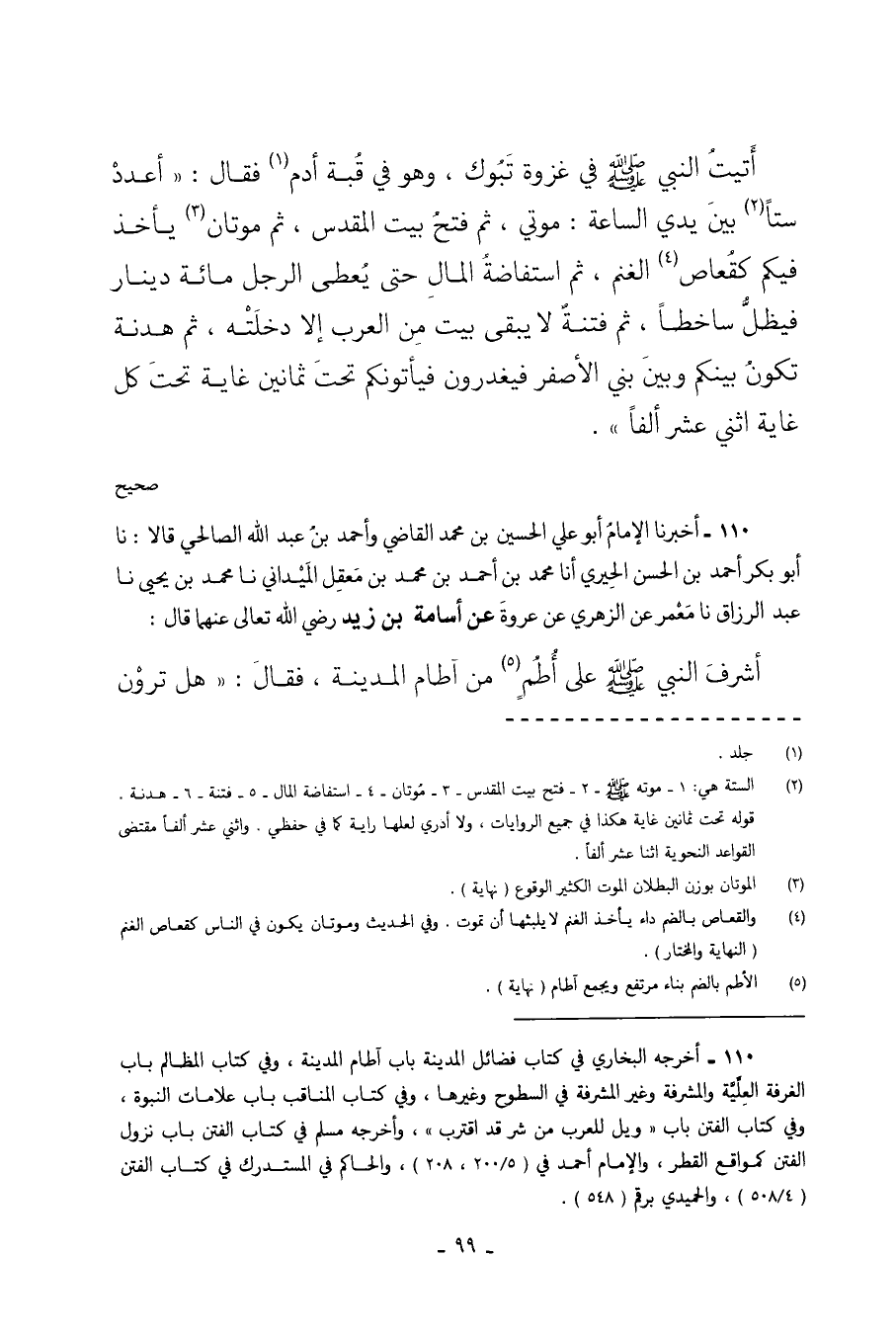 أَتَيْتُ النَّبِيَّ صَلَّى اللهُ عَلَيْهِ وَسَلَّمَ فِي غَزْوَةِ تَبُوكَ وَهُوَ فِي قُبَّةِ أَدَمٍ فَقَالَ اعْدُدْ سِتًّا بَيْنَ يَدَيِ السَّاعَةِ مَوْتِي ثُمَّ فَتْحُ بَيْتِ الْمَقْدِسِ ثُمَّ مُوتَانٌ يَأْخُذُ فِيكُمْ كَقُعَاصِ الْغَنَمِ ثُمَّ اسْتِفَاضَةُ الْمَالِ حَتَّى يُعْطَى الرَّجُلُ مِائَةَ دِينَارٍ فَيَظَلُّ سَاخِطًا ثُمَّ فِتْنَةٌ لا يَبْقَى بَيْتٌ مِنَ الْعَرَبِ إِلا دَخَلَتْهُ ثُمَّ هُدْنَةٌ تَكُونُ بَيْنَكُمْ وَبَيْنَ بَنِي الأَصْفَرِ فَيَغْدِرُونَ فَيَأْتُونَكُمْ تَحْتَ ثَمَانِينَ غَايَةً تَحْتَ كل غاية اثني عشر ألفا. صحيح