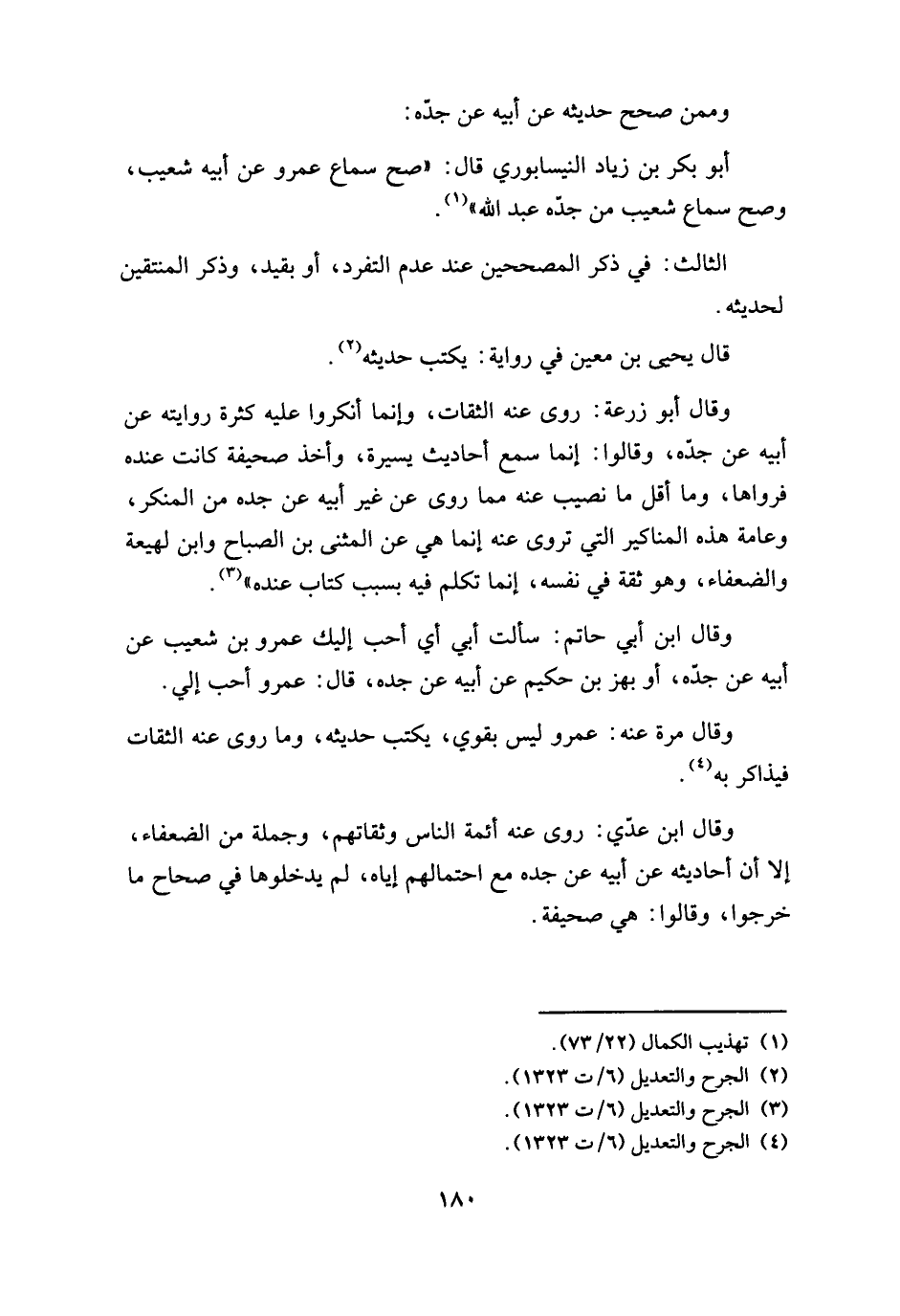 أبو بكر بن زياد النيسابوري قال: " صح سماع عمرو عن أبيه شعيب، وصح سماع شعيب من جدّه عبد الله ".