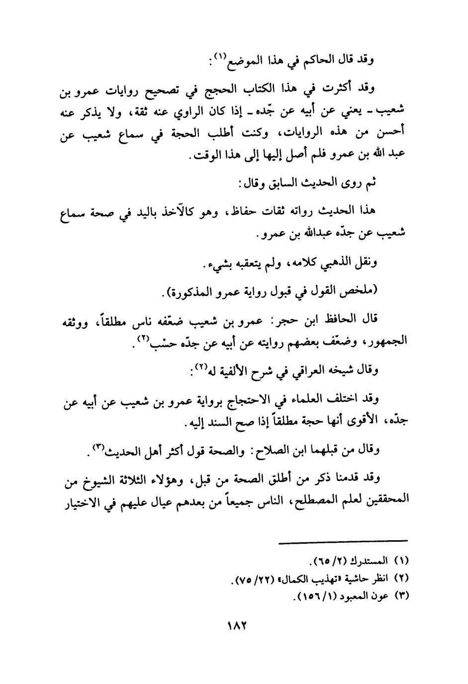وقد قال الحاكم في هذا الموضع: وقد أكثرت في هذا الكتاب الحجج في تصحيح روايات عمرو بن شعيب - يعني عن أبيه عن جده - إذا كان الراوي عنه ثقة، ولا يذكر عنه أحسن من هذه الروايات، وكنت أطلب الحجة في سماع شعيب عن عبد الله بن عمرو فلم أصل إليها إلى هذا الوقت.