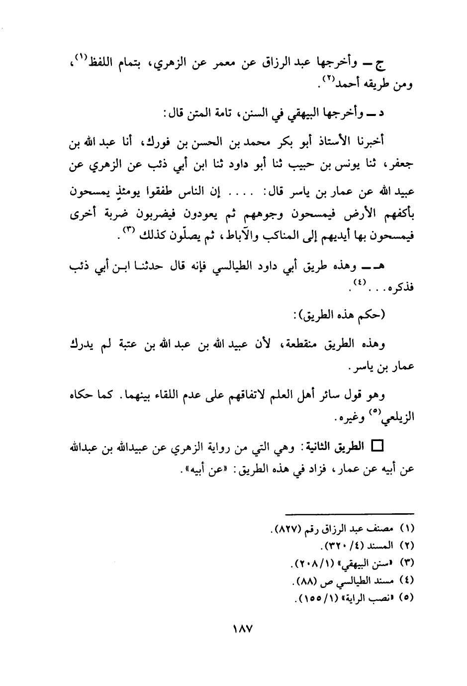 ° الطريق الثانية: وهي التي من رواية الزهري عن عبيد الله بن عبد الله عن أبيه عن عمار، فزاد في هذه الطريق: " عن أبيه ".