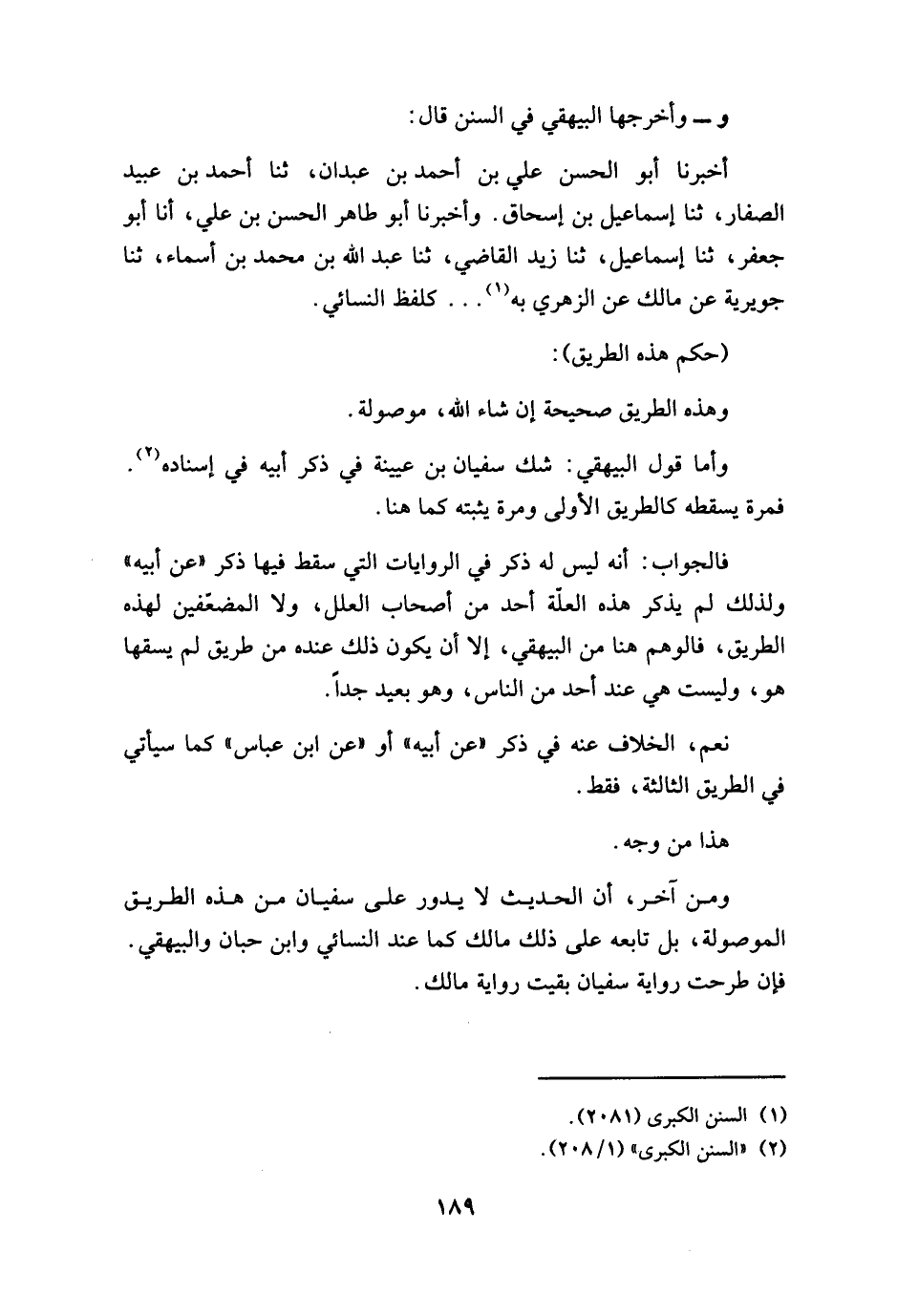 فالجواب: أنه ليس له ذكر في الروايات التي سقط فيها ذكراً عن أبيه " ولذلك لم يذكر هذه العلة أحد من أصحاب العلل، ولا المضعفين لهذه الطريق، فالوهم هنا من البيهقي، إلا أن يكون ذلك عنده من طريق لم يسقها هو، وليست هي عند أحد من الناس، وهو بعيد جداً.