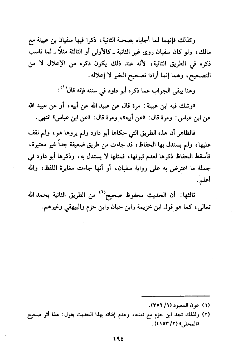 وكذلك فإنهما لما أجاباه بصحة الثانية، ذكرا فيها سفيان بن عيينة مع مالك، ولو كان سفيان روى غير الثانية - كالأولى أو الثالثة مثلاً - لما ناسب ذكره في الطريق الثانية، لأنه عند ذلك يكون ذكره من الإعلال لا من التصحيح، وهما إنما أرادا تصحيح الخبر لا إعلاله.