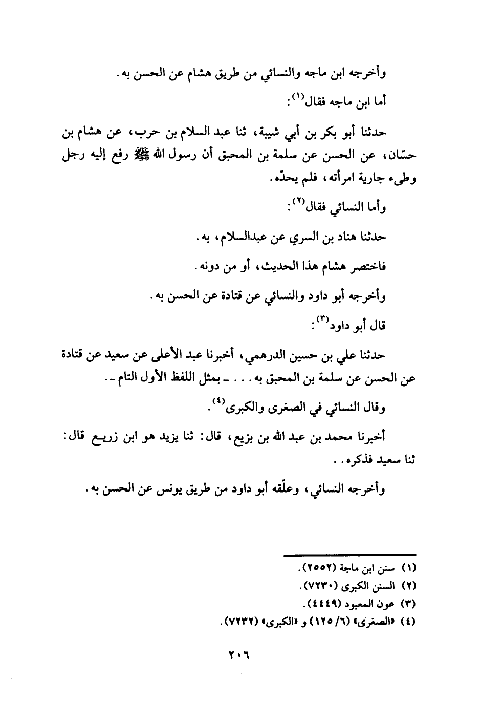أما ابن ماجه فقال: حدثنا أبو بكر بن أبي شيبة، ثنا عبد السلام بن حرب، عن هشام بن حسان، عن الحسن عن سلمة بن المحبق أن رسول الله - صلى الله عليه وسلم - رفع إليه رجل وطئ جارية امرأته، فلم يحده.