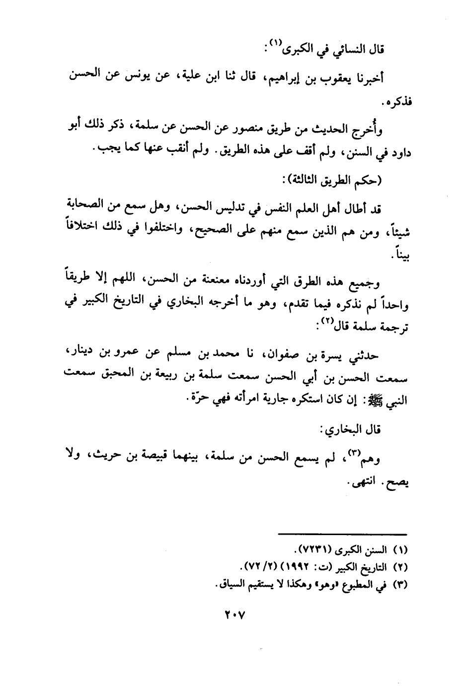 وجميع هذه الطرق التي أوردناه معنعنة من الحسن، اللهم إلا طريقا واحداً لم نذكره فيما تقدم، وهو ما أخرجه البخاري في التاريخ الكبير في ترجمة سلمة قال: حدثني يسرة بن صفوان، نا محمد بن مسلم عن عمرو بن دينار، سمعت الحسن بن أبي الحسن سمعت سلمة بن ربيعة بن المحبق سمعت النبي - صلى الله عليه وسلم -: إن كان استكره جارية امرأته فهي حرة.