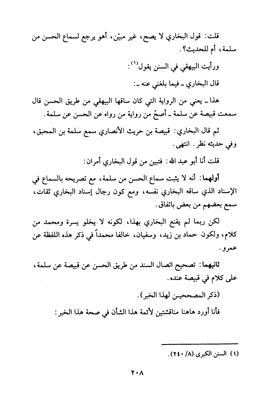 ورأيت البيهقي في السنن يقول: قال البخاري - فيما بلغني عنه -: هذا - يعني من الرواية التي كان ساقها البيهقي من طريق الحسن قال سمعت قبيصة عن سلمة - أصح من رواية من رواه عن الحسن عن سلمة.