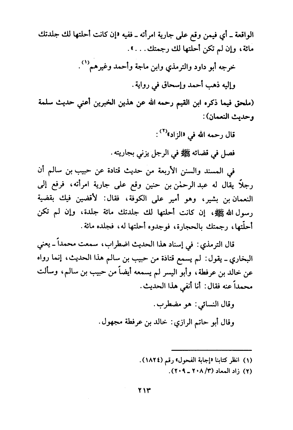 في المسند والسنن الأربعة من حديث قتادة عن حبيب بن سالم أن رجلاً يقال له عبد الرحمن بن حنين وقع على جارية امرأته، فرفع إلى النعمان بن بشير، وهو أمير على الكوفة، فقال: لأقضين فيك بقضية رسول الله - صلى الله عليه وسلم -، إن كانت أحلتها لك جلدتك مائة جلدة، وإن لم تكن أحقلّها، رجمتك بالحجارة، فوجدوه أحلتها له، فجلده مائة.
