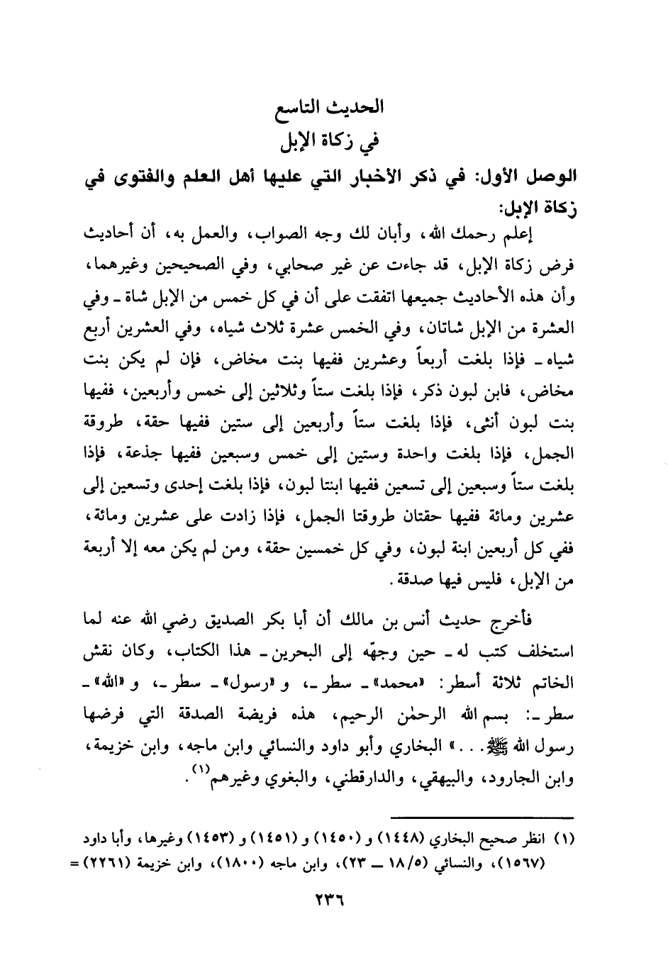 إعلم رحمك الله، وأبان لك وجه الصواب، والعمل به، أن أحاديث فرض زكاة الإبل، قد جاءت عن غير صحابي، وفي الصحيحين وغيرهما، وأن هذه الأحاديث جميعها اتفقت على أن في كل خمس من الإبل شاة - وفي العشرة من الإبل شاتان، وفي الخمس عشرة ثلاث شياه، وفي العشرين أربع شياه - فإذا بلغت أربعاً وعشرين ففيها بنت مخاض، فإن لم يكن بنت مخاض، فابن لبون ذكر، فإذا بلغت ستاً وثلاثين إلى خمس وأربعين، ففيها بنت لبون أنثى، فإذا بلغت ستاً وأربعين إلى ستين ففيها حقة، طروقة الجمل، فإذا بلغت واحدة وستين إلى خمس وسبعين ففيها جذعة، فإذا بلغت ستاً وسبعين إلى تسعين ففيها ابنتا لبون، فإذا بلغت إحدى وتسعين إلى عشرين ومائة ففيها حقتان طروقتا الجمل، فإذا زادت على عشرين ومائة، ففي كل أربعين ابنة لبون، وفي كل خمسين حقة، ومن لم يكن معه إلا أربعة من الإبل، فليس فيها صدقة.