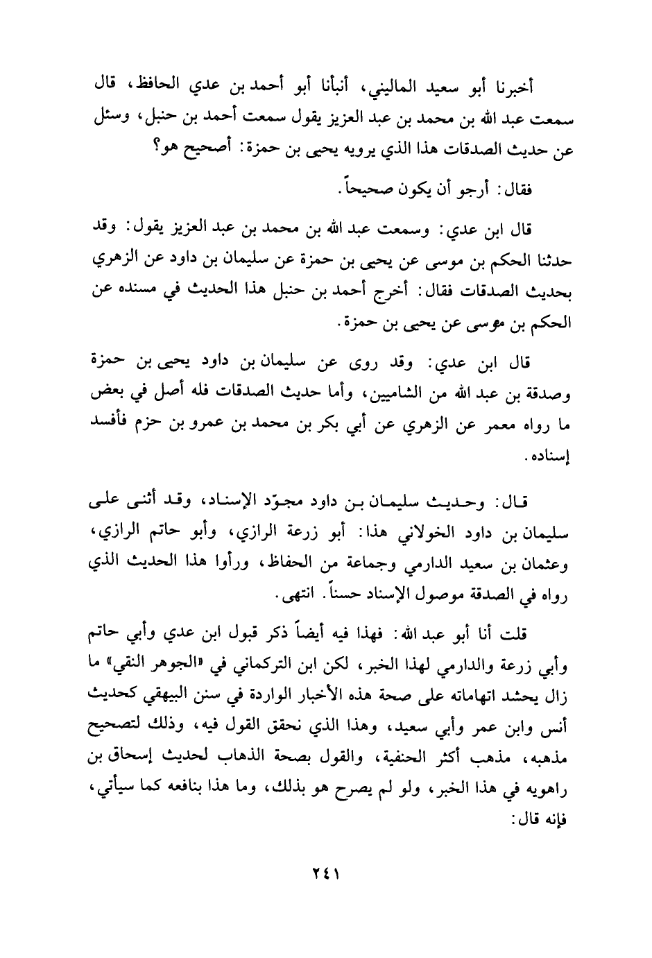 أخبرنا أبو سعيد الماليني، أنبأنا أبو أحمد بن عدي الحافظ، قال سمعت عبد الله بن محمد بن عبد العزيز يقول سمعت أحمد بن حنبل، وسئل عن حديث الصدقات هذا الذي يرويه يحيى بن حمزة: أصحيح هو؟ فقال: أرجو أن يكون صحيحاً.