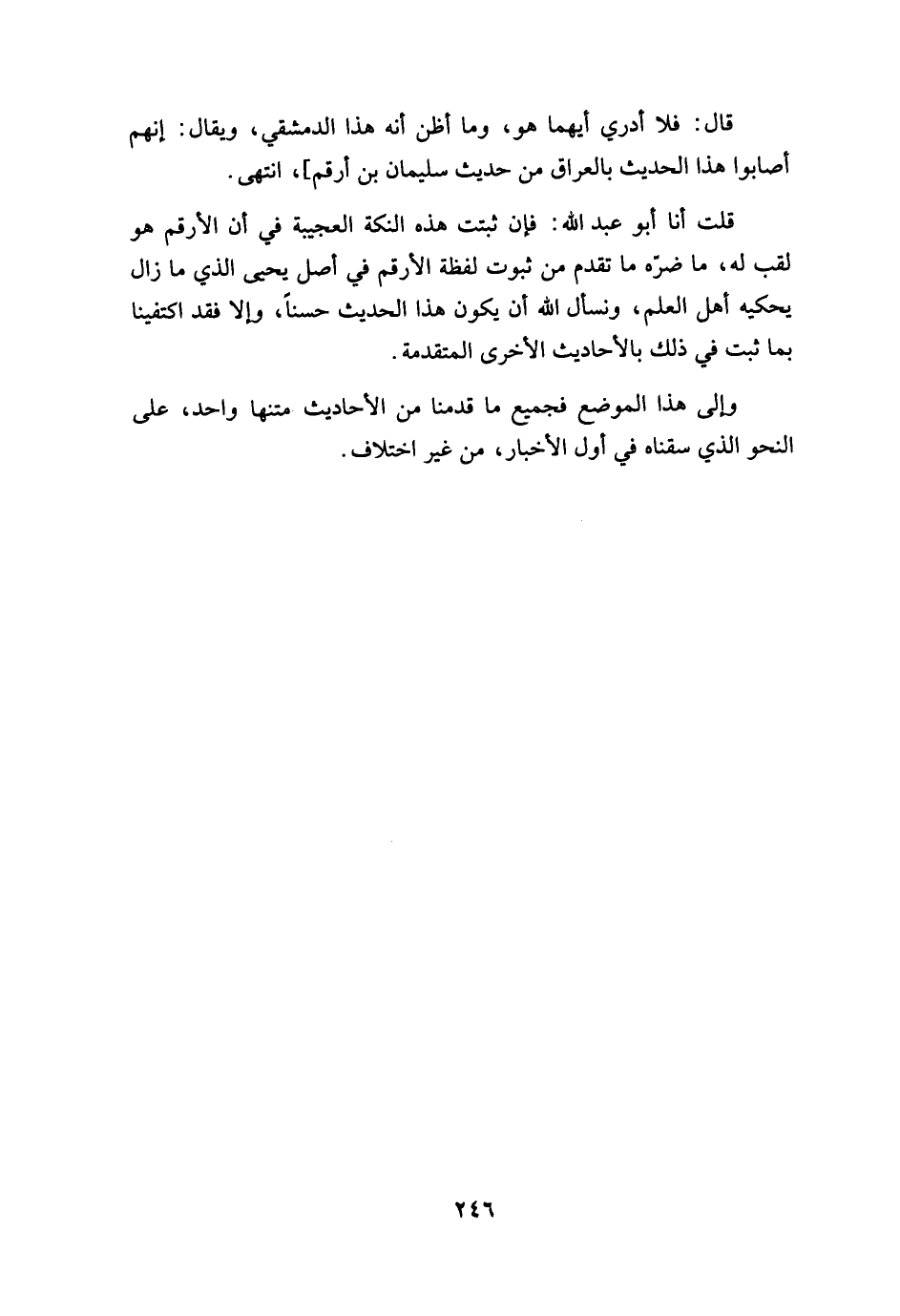 قلت أنا أبو عبد الله: فإن ثبتت هذه النكة العجيبة في أن الأرقم هو لقب له، ما ضره ما تقدم من ثبوت لفظة الأرقم في أصل يحيى الذي ما زال يحكيه أهل العلم، ونسأل الله أن يكون هذا الحديث حسناً، وإلا فقد اكتفينا بما ثبت في ذلك بالأحاديث الأخرى المتقدمة.