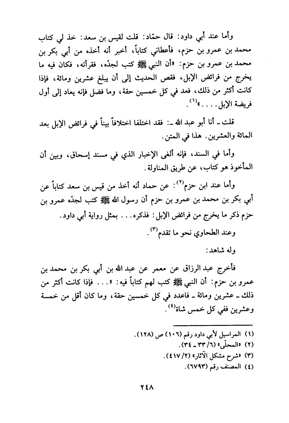 وأما عند ابن حزم: عن حماد أنه أخذ من قيس بن سعد كتاباً عن أبي بكر بن محمد بن عمرو بن حزم أن رسول الله - صلى الله عليه وسلم - كتب لجدّه عمرو بن حزم ذكر ما يخرج من فرائض الإبل: فذكره. . . بمثل رواية أبي داود.
