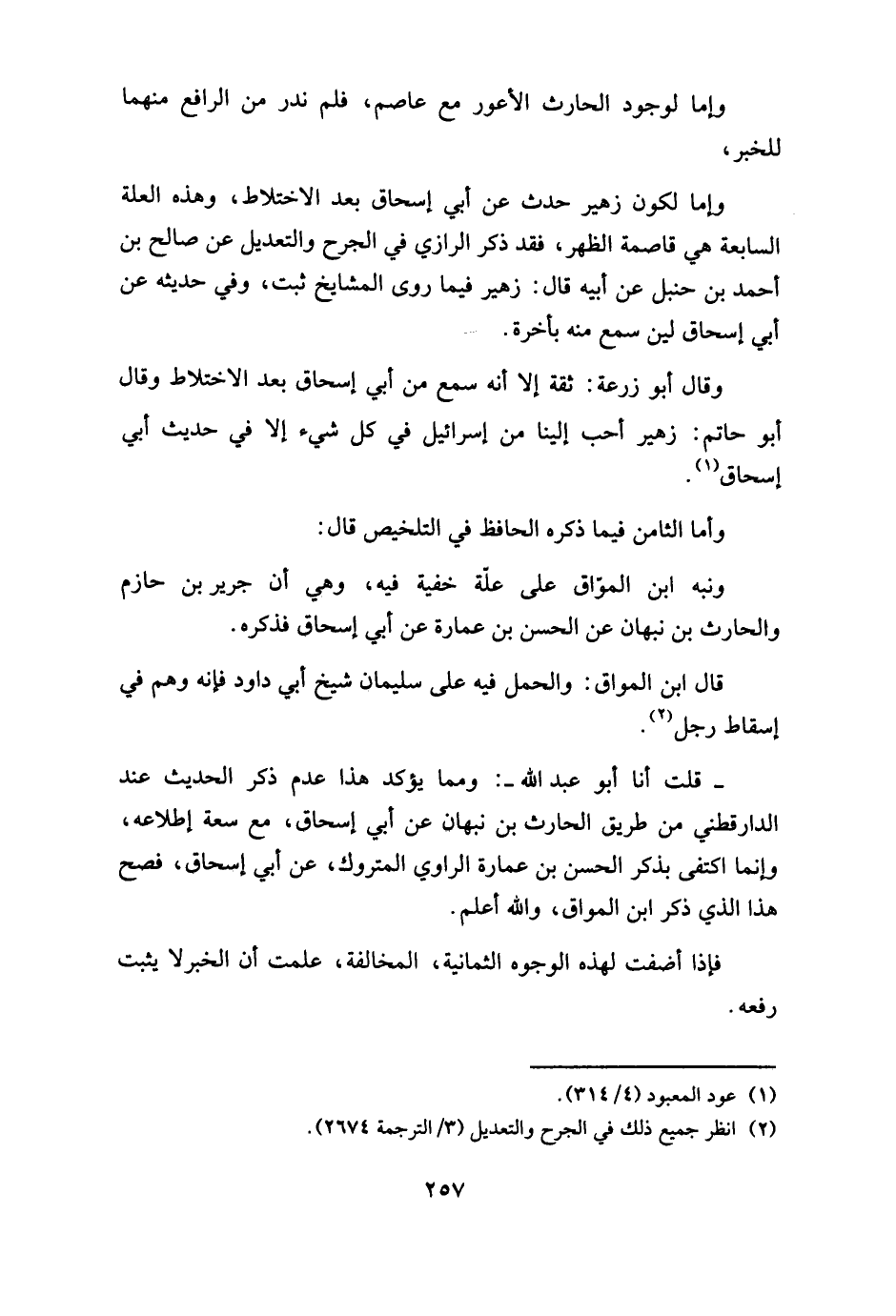 وإما لوجود الحارث الأعور مع عاصم، فلم ندر من الرافع منهما للخبر، وإما لكون زهير حدث عن بي إسحاق بعد الاختلاط، وهذه العلة السابعة هي قاصمة الظهر، فقد ذكر الرازي في الجرح والتعديل عن صالح بن أحمد بن حنبل عن أبيه قال: زهير فيما روى المشايخ ثبت، وفي حديثه عن أبي إسحاق لين سمع منه بأخرة.